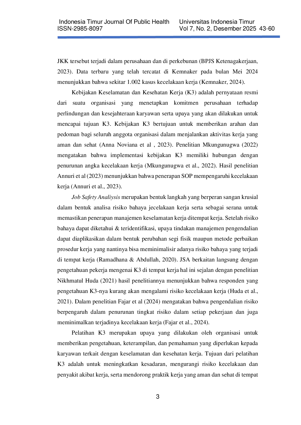 Indonesia Timur Journal of Public HealthIndonesia Timur Journal of Public HealthKecelakaan kerja di Indonesia, khususnya di sektor industri, terus meningkat, termasuk di PT. Sinergi Gula Nusantara Pabrik Gula Takalar. Penelitian ini bertujuan menggambarkan penerapan Kesehatan dan Keselamatan Kerja (K3) terhadap kecelakaan pada pekerja PT. Sinergi Gula Nusantara Pabrik Gula Takalar. Metode yang digunakan adalah kualitatif dengan pendekatan studi lapangan, melibatkan in depth interview dengan lima informan yang dipilih menggunakan teknik snowball sampling. Informan kunci adalah sekretaris tim P2K3, anggota tim P3K sebagai informan pendukung dan asisten manajer sebagai informan biasa. Hasil penelitian menunjukkan bahwa kebijakan K3 telah diterapkan secara komprehensif, dengan sertifikasi SMK3 kategori emas dan prosedur kerja yang aman. Pelaksanaan Job Safety Analysis (JSA) di setiap stasiun kerja membantu mengidentifikasi dan mengendalikan risiko. Pelatihan K3 yang rutin meningkatkan kesadaran pekerja tentang keselamatan. Penanganan kecelakaan kerja dilakukan secara sistematis, mencakup pertolongan pertama, pelaporan, dan jaminan BPJS, yang berkontribusi pada pengurangan insiden. Dengan implementasi kebijakan K3, JSA, dan pelatihan, PT. Sinergi Gula Nusantara Pabrik Gula Takalar berhasil mencegah dan mengurangi frekuensi kecelakaan kerja, serta mendukung pemulihan pekerja yang mengalami kecelakaan.
