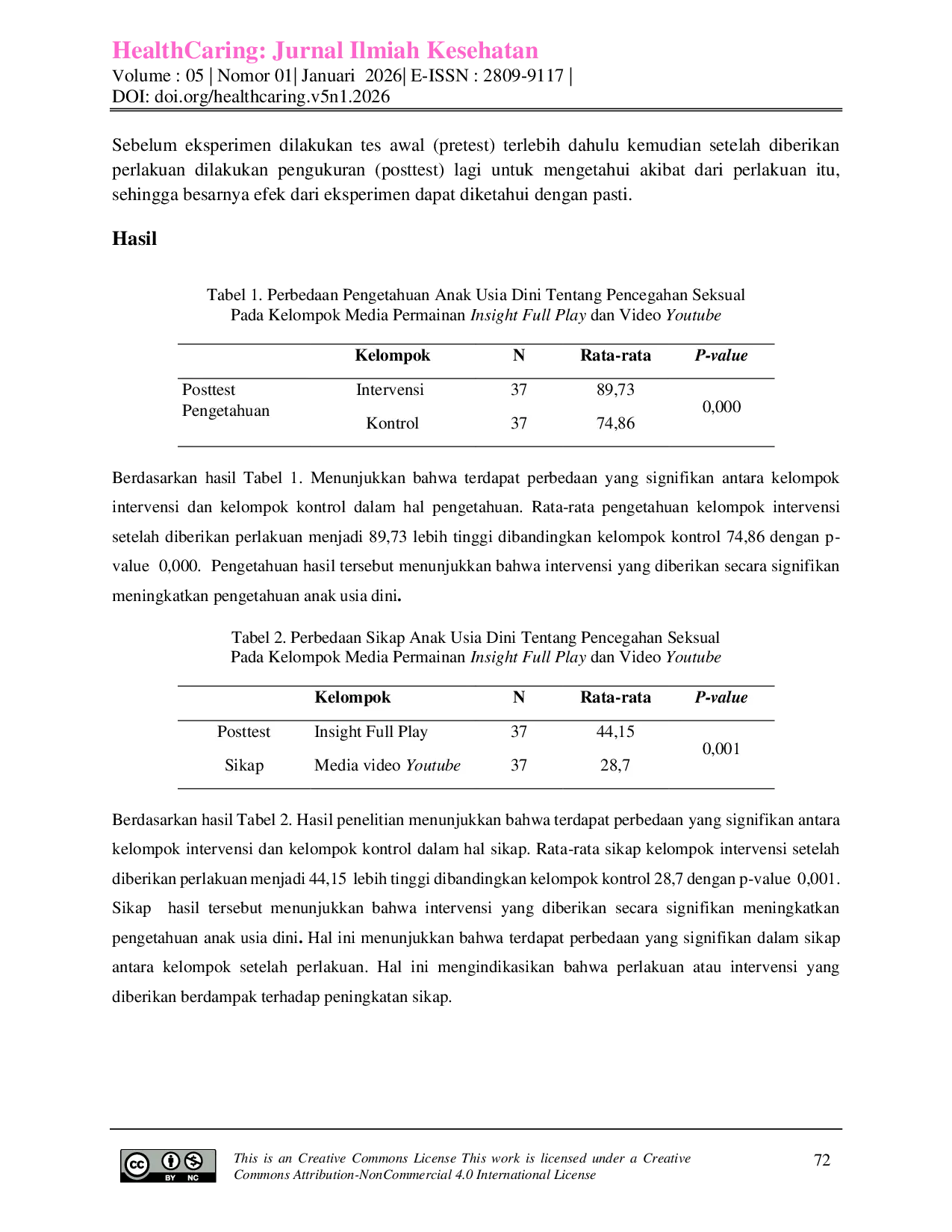 Healthcaring: Jurnal Ilmiah KesehatanHealthcaring: Jurnal Ilmiah KesehatanPeran media pembelajaran dalam PAUD sangatlah penting. Dengan media yang tepat, konsep dasar belajar sambil bermain dapat terwujud. Media permainan edukatif Insight Full Play yang merupakan suatu upaya dalam menangani masalah kekerasan seksual pada usia dini melalui pengetahuan dan sikap anak. Penelitian ini bertujuan untuk menganalisis efektivitas media permainan edukatif Insight Full Play dibandingkan video Youtube terhadap peningkatan pengetahuan dan sikap anak usia dini tentang pencegahan kekerasan seksual di PAUD Al-Masturoh Palembang pada tahun 2025. Penelitian ini menggunakan metode kuantitatif dengan quasi experimental two group design prestest posttest. Hasil penelitian menunjukkan bahwa terjadi peningkatan pengetahuan baik pada kelompok video edukasi maupun kelompok Insight Full Play. Kelompok media video Youtube memperoleh nilai N-Gain sebesar 44,5 yang termasuk dalam kategori sedang, sedangkan kelompok media Insight Full Play memperoleh nilai N-Gain sebesar 76,5 yang juga termasuk dalam kategori sedang, namun berada pada tingkat yang lebih tinggi dibandingkan kelompok media video Youtube. Hasil ini menunjukkan bahwa media Insight Full Play yang diberikan lebih efektif dalam meningkatkan pengetahuan dan sikap anak usia dini tentang pencegahan kekerasan seksual.