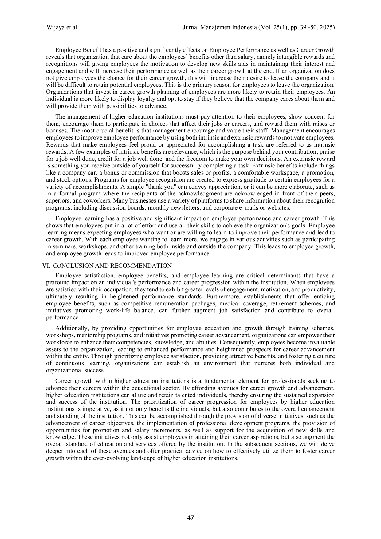 Jurnal Manajemen IndonesiaJurnal Manajemen IndonesiaBisnis saat ini sangat mementingkan kinerja karyawannya karena berkorelasi langsung dengan pertumbuhan dan peningkatan pendapatan. Penelitian ini bertujuan untuk menganalisa dampak kepuasan karyawan, tunjangan karyawan, dan pembelajaran karyawan terhadap pertumbuhan karir dan kinerja karyawan. Total responden 400 orang yang bekerja di Perguruan Tinggi di Indonesia menjadi titik fokus penelitian ini. Responden dipilih melalui purposive sampling, diberikan kuesioner untuk mengumpulkan data. Untuk mengevaluasi hubungan yang dihipotesiskan, para peneliti menggunakan analisis model persamaan struktural dengan menggunakan AMOS 26. Temuan penelitian ini mengungkapkan bahwa kinerja karyawan dan pertumbuhan karir di perguruan tinggi di Indonesia dipengaruhi secara signifikan oleh pembelajaran karyawan, tunjangan karyawan, dan kepuasan karyawan. Selain itu, kinerja karyawan terbukti memiliki pengaruh besar dan positif terhadap pertumbuhan karir. Temuan ini memberikan kontribusi wawasan berharga dan menawarkan panduan praktis untuk pengambilan keputusan manajerial. Implikasi teoretis dan praktis dari temuan ini dapat menjadi landasan kuat bagi upaya penelitian di masa depan yang bertujuan untuk mengeksplorasi pertumbuhan karier. Disarankan agar manajemen perguruan tinggi mengutamakan pertumbuhan karir pegawainya.
