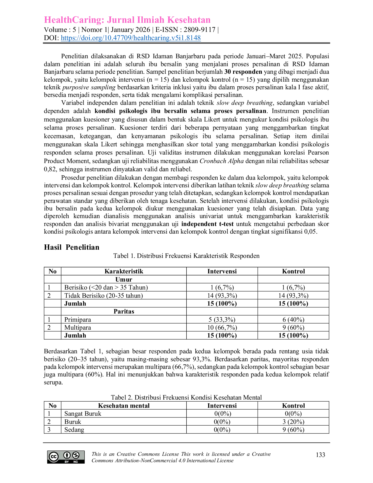 Healthcaring: Jurnal Ilmiah KesehatanHealthcaring: Jurnal Ilmiah KesehatanProses persalinan tidak hanya melibatkan perubahan fisiologis, tetapi juga respons psikologis yang dapat memengaruhi pengalaman persalinan ibu. Selama persalinan diketahui dapat meningkatkan kecemasan dan ketegangan yang dapat meningkatkan persepsi nyeri serta berpotensi memengaruhi kemajuan persalinan. Salah satu pendekatan non-farmakologis yang dapat digunakan untuk membantu ibu mengelola respons psikologis selama persalinan adalah teknik relaksasi pernapasan, seperti slow deep breathing. Penelitian ini bertujuan untuk menganalisis pengaruh teknik slow deep breathing terhadap kondisi psikologis ibu bersalin di RSD Idaman Banjarbaru. Penelitian ini menggunakan desain quasi experimental dengan pendekatan posttest-only control group design. Sampel penelitian berjumlah 30 ibu bersalin yang dibagi menjadi dua kelompok, yaitu kelompok intervensi (n = 15) dan kelompok kontrol (n = 15) yang dipilih menggunakan teknik purposive sampling. Kelompok intervensi diberikan latihan teknik slow deep breathing selama proses persalinan, sedangkan kelompok kontrol menerima perawatan standar. Kondisi psikologis ibu diukur menggunakan kuesioner skala Likert yang telah melalui uji validitas dan reliabilitas (Cronbachs alpha = 0,82). Analisis data dilakukan menggunakan uji independent t-test dengan tingkat signifikansi 0,05. Hasil penelitian menunjukkan bahwa rata-rata skor kondisi psikologis pada kelompok intervensi lebih tinggi dibandingkan kelompok kontrol (55,93 vs 34,80). Sebagian besar responden pada kelompok intervensi berada pada kategori kondisi psikologis baik (66,7%) dan sangat baik (33,3%), sedangkan pada kelompok kontrol mayoritas responden berada pada kategori sedang (60%) dan buruk (20%). Hasil uji statistik menunjukkan perbedaan yang signifikan antara kedua kelompok (p < 0,001). Temuan ini menunjukkan bahwa teknik slow deep breathing berpotensi membantu meningkatkan kondisi psikologis ibu selama proses persalinan. Oleh karena itu, teknik ini dapat dipertimbangkan sebagai salah satu intervensi non-farmakologis yang dapat diterapkan oleh tenaga kesehatan dalam mendukung kenyamanan psikologis ibu selama persalinan.