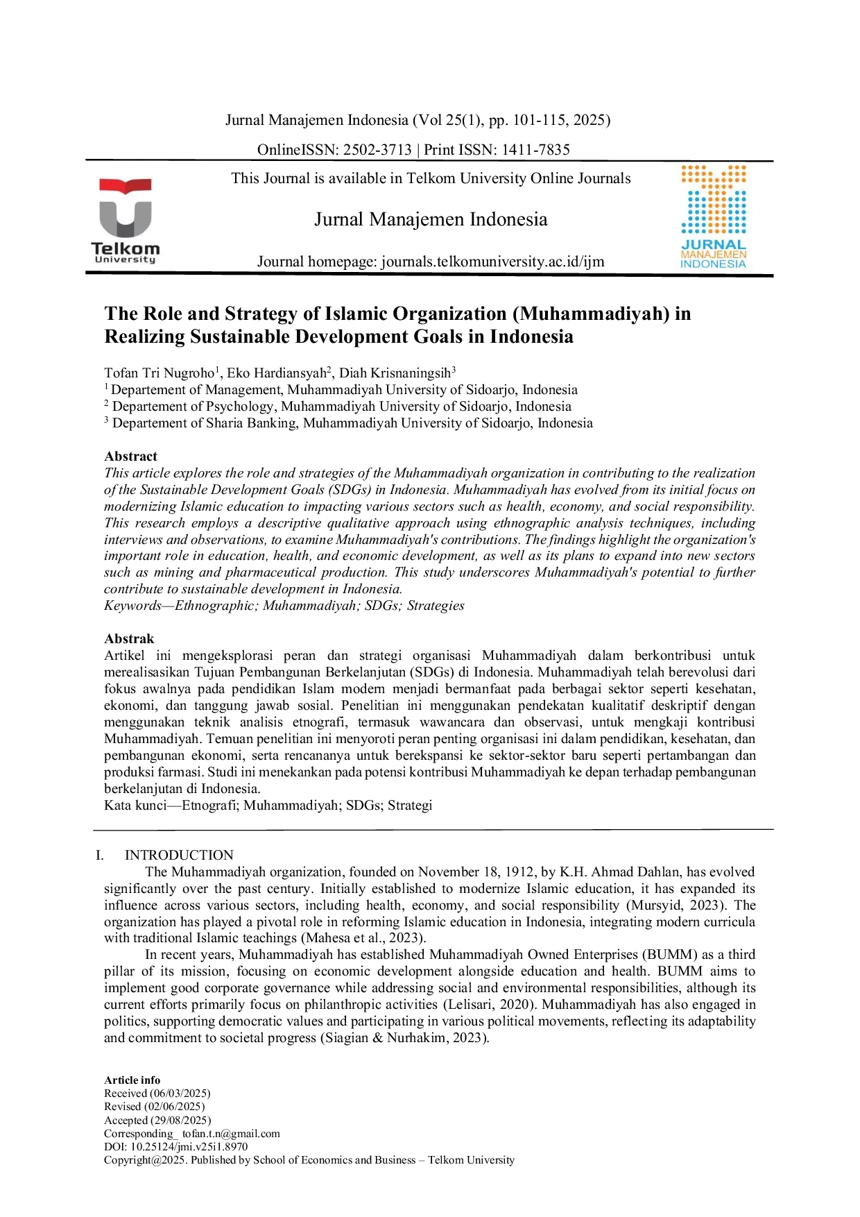 Jurnal Manajemen IndonesiaJurnal Manajemen IndonesiaArtikel ini mengeksplorasi peran dan strategi organisasi Muhammadiyah dalam berkontribusi untuk merealisasikan Tujuan Pembangunan Berkelanjutan (SDGs) di Indonesia. Muhammadiyah telah berevolusi dari fokus awalnya pada pendidikan Islam modern menjadi bermanfaat pada berbagai sektor seperti kesehatan, ekonomi, dan tanggung jawab sosial. Penelitian ini menggunakan pendekatan kualitatif deskriptif dengan menggunakan teknik analisis etnografi, termasuk wawancara dan observasi, untuk mengkaji kontribusi Muhammadiyah. Temuan penelitian ini menyoroti peran penting organisasi ini dalam pendidikan, kesehatan, dan pembangunan ekonomi, serta rencananya untuk berekspansi ke sektor-sektor baru seperti pertambangan dan produksi farmasi. Studi ini menekankan pada potensi kontribusi Muhammadiyah ke depan terhadap pembangunan berkelanjutan di Indonesia.