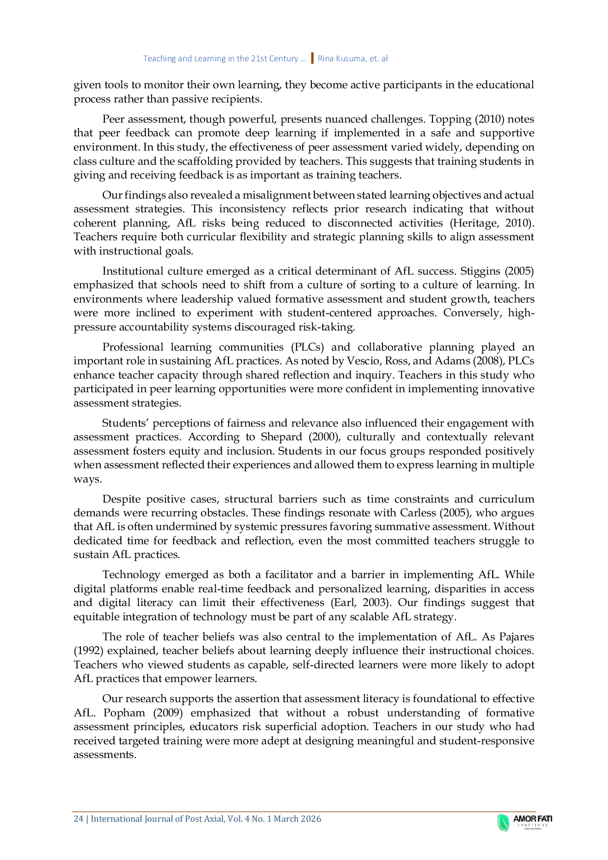 International Journal of Post Axial: Futuristic Teaching and LearningInternational Journal of Post Axial: Futuristic Teaching and LearningPenelitian ini menyelidiki bagaimana praktik Assessment for Learning (AfL) dapat menjadi jembatan antara metode instruksional tradisional dan pengembangan agen siswa di kelas kontemporer. Menggunakan pendekatan studi kasus kualitatif, penelitian ini menyelidiki cara-cara di mana strategi penilaian formatif - seperti umpan balik, penilaian diri, dan pengaturan tujuan - mengubah dinamika guru-siswa dan memberdayakan pembelajar untuk mengambil peran aktif dalam proses pembelajaran mereka. Data dikumpulkan melalui wawancara, observasi kelas, dan analisis dokumen di berbagai konteks sekolah. Temuan mengungkapkan bahwa AfL tidak hanya meningkatkan prestasi akademik tetapi juga memperkuat motivasi siswa, metacognition, dan otonomi. Guru yang mengintegrasikan praktik AfL ke dalam instruksinya mencatat peningkatan keterlibatan siswa dan trajektor belajar yang lebih jelas. Namun, tantangan sistemik seperti standar kurikulum yang kaku dan kebijakan penilaian menghambat implementasi penuh AfL. Penelitian ini menyimpulkan bahwa pengembangan profesional guru AfL yang efektif, dukungan berkelanjutan, dan pergeseran budaya menuju pedagogi yang berpusat pada pembelajar diperlukan. Temuan ini menawarkan implikasi untuk kebijakan pendidikan, praktik kelas, dan program pelatihan guru yang bertujuan untuk meningkatkan baik hasil belajar maupun pemberdayaan siswa.