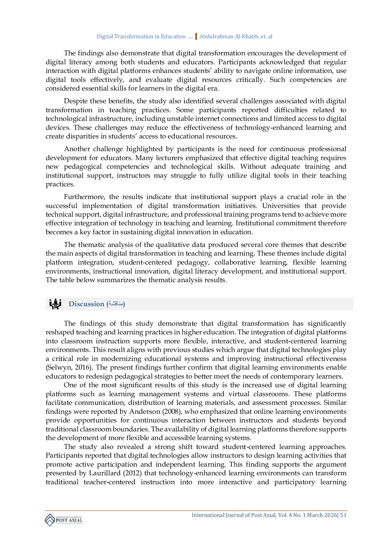 International Journal of Post Axial: Futuristic Teaching and LearningInternational Journal of Post Axial: Futuristic Teaching and LearningTransformasi digital telah menjadi isu sentral dalam pendidikan kontemporer, terutama dalam pengembangan strategi pengajaran yang efektif yang selaras dengan tuntutan pembelajaran abad ke-21. Penelitian ini bertujuan untuk mengeksplorasi bagaimana teknologi digital mendukung praktik pengajaran inovatif dan meningkatkan efektivitas pembelajaran di perguruan tinggi. Penelitian ini menggunakan desain kualitatif dengan pendekatan studi kasus untuk mengkaji implementasi strategi pengajaran digital di ruang kelas universitas. Data dikumpulkan melalui wawancara semi-terstruktur dengan dosen, observasi kelas, dan analisis dokumen institusi terkait inisiatif pembelajaran digital. Data dianalisis menggunakan analisis tematik untuk mengidentifikasi pola dan tema utama terkait transformasi digital dalam praktik pengajaran dan pembelajaran. Temuan menunjukkan bahwa integrasi platform digital, alat kolaboratif, dan sumber daya multimedia secara signifikan meningkatkan keterlibatan mahasiswa, mendukung lingkungan pembelajaran yang berpusat pada mahasiswa, dan memperkuat pembelajaran yang fleksibel. Selain itu, transformasi digital mendorong pengembangan kompetensi penting abad ke-21 seperti literasi digital, kolaborasi, dan berpikir kritis. Namun, penelitian ini juga mengidentifikasi beberapa tantangan, termasuk keterbatasan infrastruktur teknologi dan kebutuhan akan pengembangan profesional berkelanjutan bagi pendidik. Secara keseluruhan, hasil menunjukkan bahwa transformasi digital yang sukses dalam pendidikan memerlukan dukungan institusi yang kuat, sumber daya teknologi yang memadai, serta kesiapan pendidik untuk mengadopsi strategi pedagogis inovatif. Penelitian ini berkontribusi terhadap kajian yang terus berkembang mengenai pendidikan digital dengan menyoroti peran teknologi digital dalam menciptakan lingkungan pembelajaran yang lebih interaktif dan efektif di perguruan tinggi.