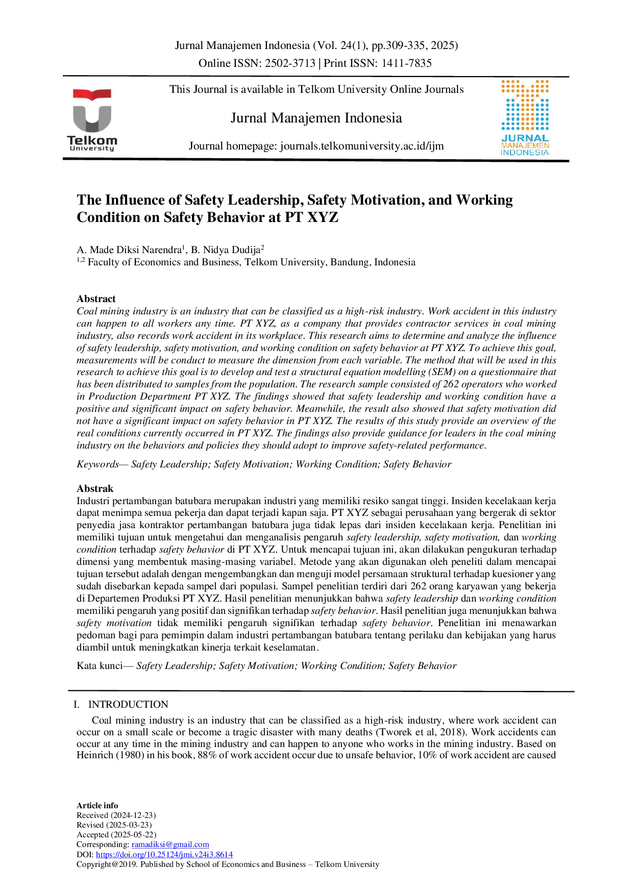 Jurnal Manajemen IndonesiaJurnal Manajemen IndonesiaIndustri pertambangan batubara merupakan industri yang memiliki resiko sangat tinggi. Insiden kecelakaan kerja dapat menimpa semua pekerja dan dapat terjadi kapan saja. PT XYZ sebagai perusahaan yang bergerak di sektor penyedia jasa kontraktor pertambangan batubara juga tidak lepas dari insiden kecelakaan kerja. Penelitian ini memiliki tujuan untuk mengetahui dan menganalisis pengaruh safety leadership, safety motivation, dan working condition terhadap safety behavior di PT XYZ. Untuk mencapai tujuan ini, akan dilakukan pengukuran terhadap dimensi yang membentuk masing-masing variabel. Metode yang akan digunakan oleh peneliti dalam mencapai tujuan tersebut adalah dengan mengembangkan dan menguji model persamaan struktural terhadap kuesioner yang sudah disebarkan kepada sampel dari populasi. Sampel penelitian terdiri dari 262 orang karyawan yang bekerja di Departemen Produksi PT XYZ. Hasil penelitian menunjukkan bahwa safety leadership dan working condition memiliki pengaruh yang positif dan signifikan terhadap safety behavior. Hasil penelitian juga menunjukkan bahwa safety motivation tidak memiliki pengaruh signifikan terhadap safety behavior. Penelitian ini menawarkan pedoman bagi para pemimpin dalam industri pertambangan batubara tentang perilaku dan kebijakan yang harus diambil untuk meningkatkan kinerja terkait keselamatan.