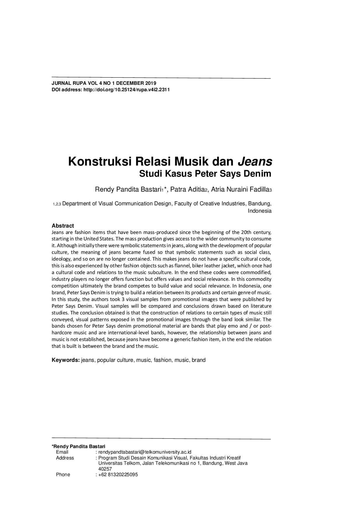 JURNAL RUPAJURNAL RUPAJeans adalah item fesyen yang telah diproduksi secara massal sejak awal abad ke-20, dimulai di Amerika Serikat. Produksi massal memberikan akses kepada masyarakat luas untuk mengonsumsinya. Meskipun pada awalnya terdapat pernyataan simbolis dalam jeans, seiring dengan perkembangan budaya populer, makna jeans menjadi menyatu sehingga pernyataan simbolis seperti kelas sosial, ideologi, dan sebagainya tidak lagi terkandung. Hal ini menyebabkan jeans tidak memiliki kode budaya spesifik, hal ini juga dialami oleh objek fesyen lainnya seperti flanel, jaket kulit biker, yang dulunya memiliki kode budaya dan hubungan dengan subkultur musik. Pada akhirnya kode-kode ini dikomodifikasi, pelaku industri tidak lagi menawarkan fungsi tetapi menawarkan nilai dan relevansi sosial. Dalam persaingan komoditas ini, merek bersaing untuk membangun nilai dan relevansi sosial. Di Indonesia, satu merek, Peter Says Denim berusaha membangun hubungan antara produknya dan genre musik tertentu. Dalam studi ini, penulis mengambil 3 sampel visual dari gambar promosi yang diterbitkan oleh Peter Says Denim. Sampel visual akan dibandingkan dan kesimpulan ditarik berdasarkan studi pustaka. Kesimpulan yang diperoleh adalah bahwa konstruksi hubungan dengan jenis musik tertentu masih tersampaikan, pola visual yang terpapar dalam gambar promosi melalui band terlihat serupa. Band yang dipilih untuk materi promosi Peter Says denim adalah band yang memainkan musik emo dan/atau post-hardcore dan merupakan band tingkat internasional, namun hubungan antara jeans dan musik tidak terjalin, karena jeans telah menjadi item fesyen generik, pada akhirnya hubungan yang dibangun adalah antara merek dan musik.
