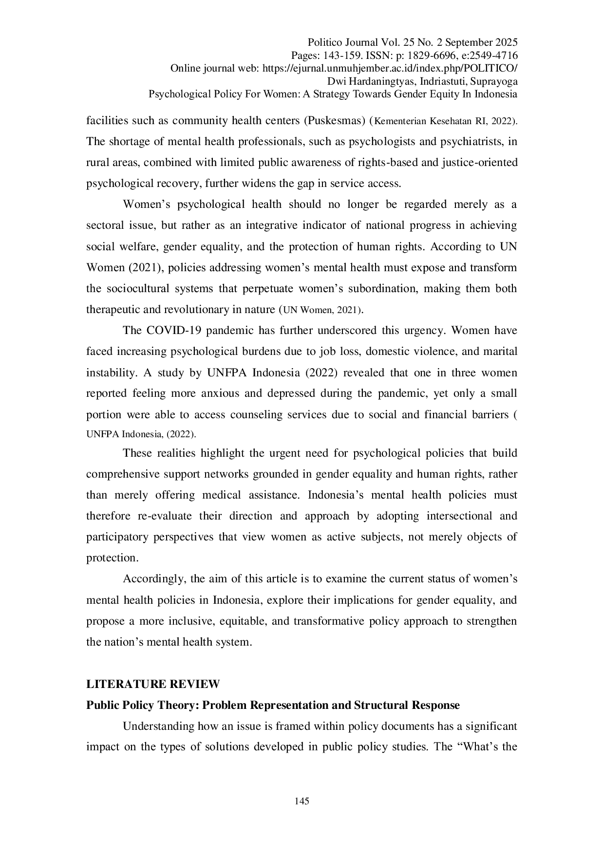 POLITICOPOLITICOPerempuan di Indonesia menghadapi kerentanan tinggi terhadap masalah kesehatan mental akibat ketidaksetaraan gender, kekerasan berbasis gender, dan kurangnya layanan psikologis yang responsif gender. Studi ini bertujuan untuk menganalisis kebijakan psikologis yang ada dan mengevaluasi dampaknya terhadap kesetaraan gender. Dengan menggunakan pendekatan tinjauan pustaka terhadap dokumen kebijakan, jurnal ilmiah, dan laporan nasional dan internasional dari lima tahun terakhir (2020–2025), ditemukan bahwa integrasi perspektif gender dalam layanan kesehatan mental masih terbatas. Kurangnya pelatihan bagi pekerja kesehatan mental, koordinasi yang lemah antar sektor, dan advokasi berbasis komunitas yang suboptimal merupakan hambatan utama. Reformasi kebijakan berbasis bukti, peningkatan kapasitas sumber daya manusia, dan penguatan peran perempuan dalam proses kebijakan merupakan strategi penting menuju kesetaraan gender dalam kesehatan mental.