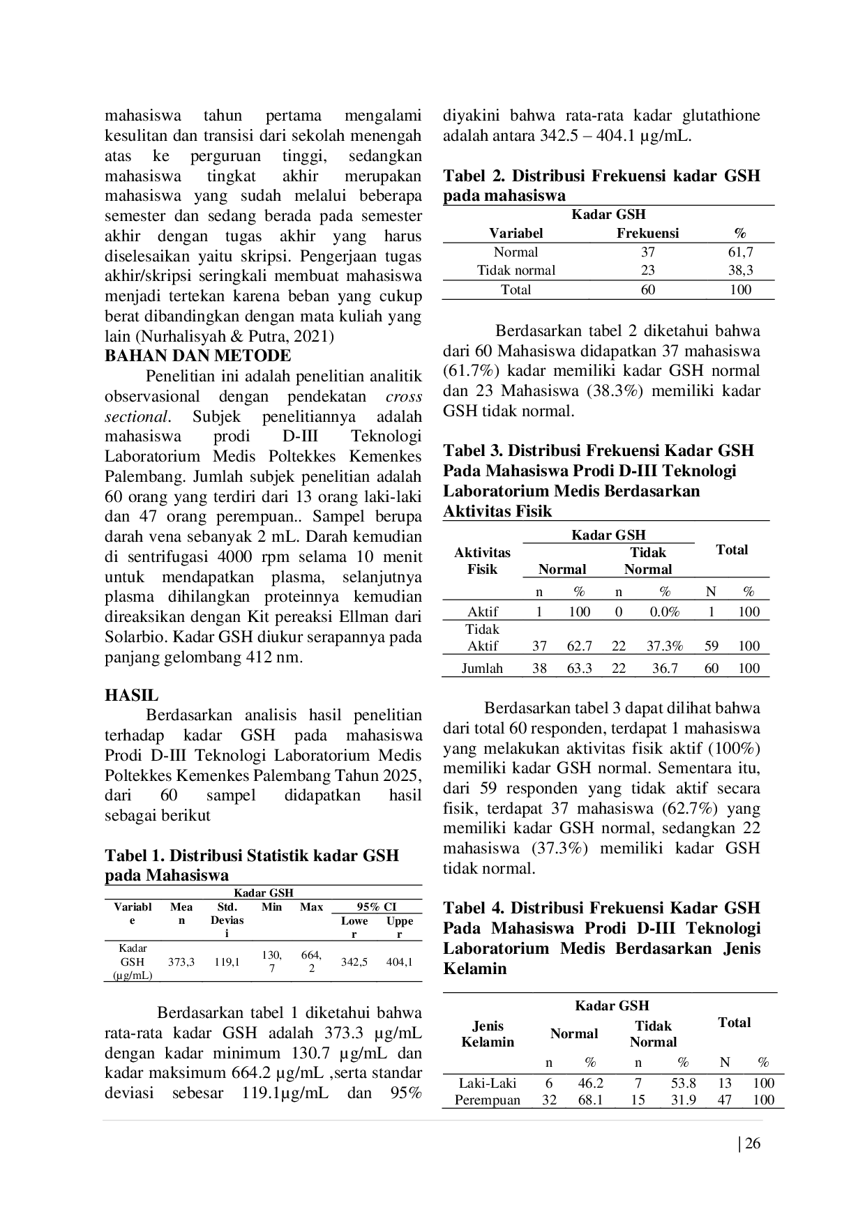 Journal of Medical Laboratory and ScienceJournal of Medical Laboratory and ScienceTubuh manusia memproduksi radikal bebas (ROS, Reactive Oxygen Species; RNS, Reactive Nitrogen Species) secara alami, namun kelebihan produksinya tanpa diimbangi dengan jumlah antioksidan yang cukup dapat menyebabkan stres oksidatif yang merusak sel dan memicu penyakit degeneratif. Antioksidan, seperti glutathione (GSH), penting untuk menetralisir radikal bebas dan menjaga keseimbangan redoks. Penelitian ini bertujuan untuk mengetahui kadar GSH pada mahasiswa Prodi D-III Teknologi Laboratorium Medis Poltekkes Kemenkes Palembang. Metode penelitian yang digunakan adalah analitik observasional dengan pendekatan cross sectional. Subjek penelitian sebanyak 60 mahasiswa. Hasil penelitian menunjukkan bahwa 37 mahasiswa (61.7%) memiliki kadar GSH normal dan 23 mahasiswa (38.3%) tidak normal. Disarankan kepada mahasiswa untuk menjaga pola hidup sehat, mengonsumsi makanan bergizi, melakukan aktivitas fisik seimbang, dan tidur cukup untuk mempertahankan kadar GSH optimal.