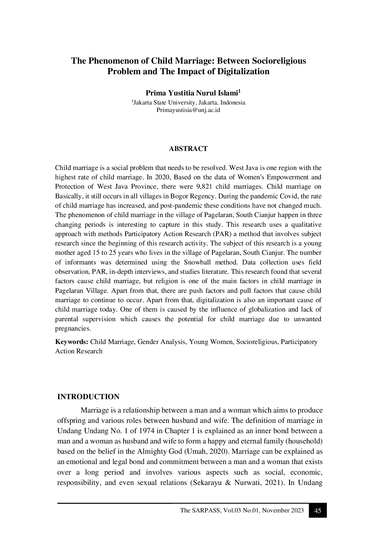 The Sunan Ampel Review of Political and Social SciencesThe Sunan Ampel Review of Political and Social SciencesPernikahan anak merupakan masalah sosial yang perlu diselesaikan. Jawa Barat adalah salah satu wilayah dengan angka pernikahan anak tertinggi. Pada tahun 2020, berdasarkan data Pemberdayaan Perempuan dan Perlindungan Provinsi Jawa Barat, terdapat 9.821 kasus pernikahan anak. Pernikahan anak pada dasarnya masih terjadi di seluruh desa di Kabupaten Bogor. Selama pandemi COVID-19, angka pernikahan anak meningkat, dan pasca-pandemi kondisi ini tidak banyak berubah. Fenomena pernikahan anak di Desa Pagelaran, Cianjur Selatan, yang terjadi dalam tiga periode perubahan menarik untuk dikaji dalam penelitian ini. Penelitian ini menggunakan pendekatan kualitatif dengan metode Participatory Action Research (PAR), yaitu metode yang melibatkan subjek penelitian sejak awal kegiatan penelitian. Subjek penelitian ini adalah ibu muda berusia 15 hingga 25 tahun yang tinggal di Desa Pagelaran, Cianjur Selatan. Jumlah informan ditentukan menggunakan metode Snowball. Pengumpulan data menggunakan observasi lapangan, PAR, wawancara mendalam, dan studi literatur. Penelitian ini menemukan bahwa beberapa faktor menyebabkan pernikahan anak, namun agama merupakan salah satu faktor utama pernikahan anak di Desa Pagelaran. Selain itu, terdapat faktor pendorong dan penarik yang menyebabkan pernikahan anak terus terjadi. Di samping itu, digitalisasi juga menjadi penyebab penting pernikahan anak saat ini. Salah satunya disebabkan oleh pengaruh globalisasi dan kurangnya pengawasan orang tua yang menyebabkan potensi pernikahan anak karena kehamilan yang tidak diinginkan.