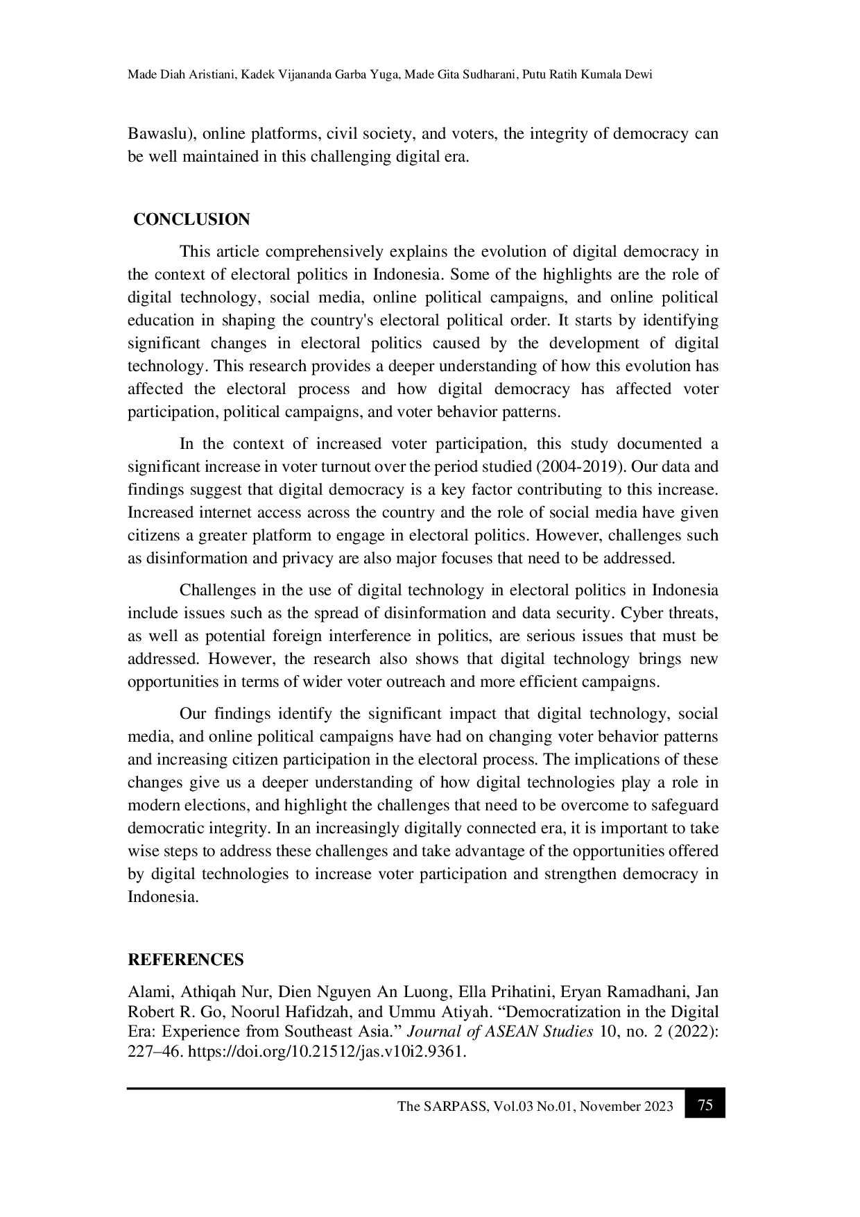 The Sunan Ampel Review of Political and Social SciencesThe Sunan Ampel Review of Political and Social SciencesEra digital membawa perubahan transformatif dalam lanskap politik elektoral di seluruh dunia. Termasuk Indonesia, sebagai negara demokrasi yang dinamis, juga tidak dapat menghindari perubahan ini. Kolaborasi antara kemajuan teknologi digital dan politik telah membentuk ulang cara kampanye pemilihan dijalankan, informasi disebarluaskan, dan warga negara Indonesia terlibat dalam proses demokrasi. Artikel ini mengkaji tantangan dan peluang yang muncul dari integrasi teknologi digital dalam tatanan demokrasi, khususnya pemilihan umum di Indonesia. Tujuan penelitian ini adalah menganalisis dampak evolusi demokrasi digital terhadap proses elektoral di Indonesia, mulai dari jangkauan pemilih dan strategi kampanye hingga upaya menjaga integritas demokrasi. Penelitian ini didasarkan pada tinjauan literatur yang komprehensif, dikombinasikan dengan analisis proses demokrasi di Indonesia. Data kualitatif dan kuantitatif digunakan untuk menggambarkan sifat politik elektoral yang berubah di era digital Indonesia. Artikel ini menunjukkan bahwa demokrasi digital dalam hal evolusi elektoral akan menjadi tak terhindarkan dan akan terus berkembang seiring waktu, dengan Indonesia sebagai negara yang terkena dampak. Hal ini dibuktikan dengan bagaimana teknologi digital telah mendemokratisasi partisipasi politik di Indonesia, mendorong peningkatan keterlibatan warga serta menghadirkan tantangan dan peluang.