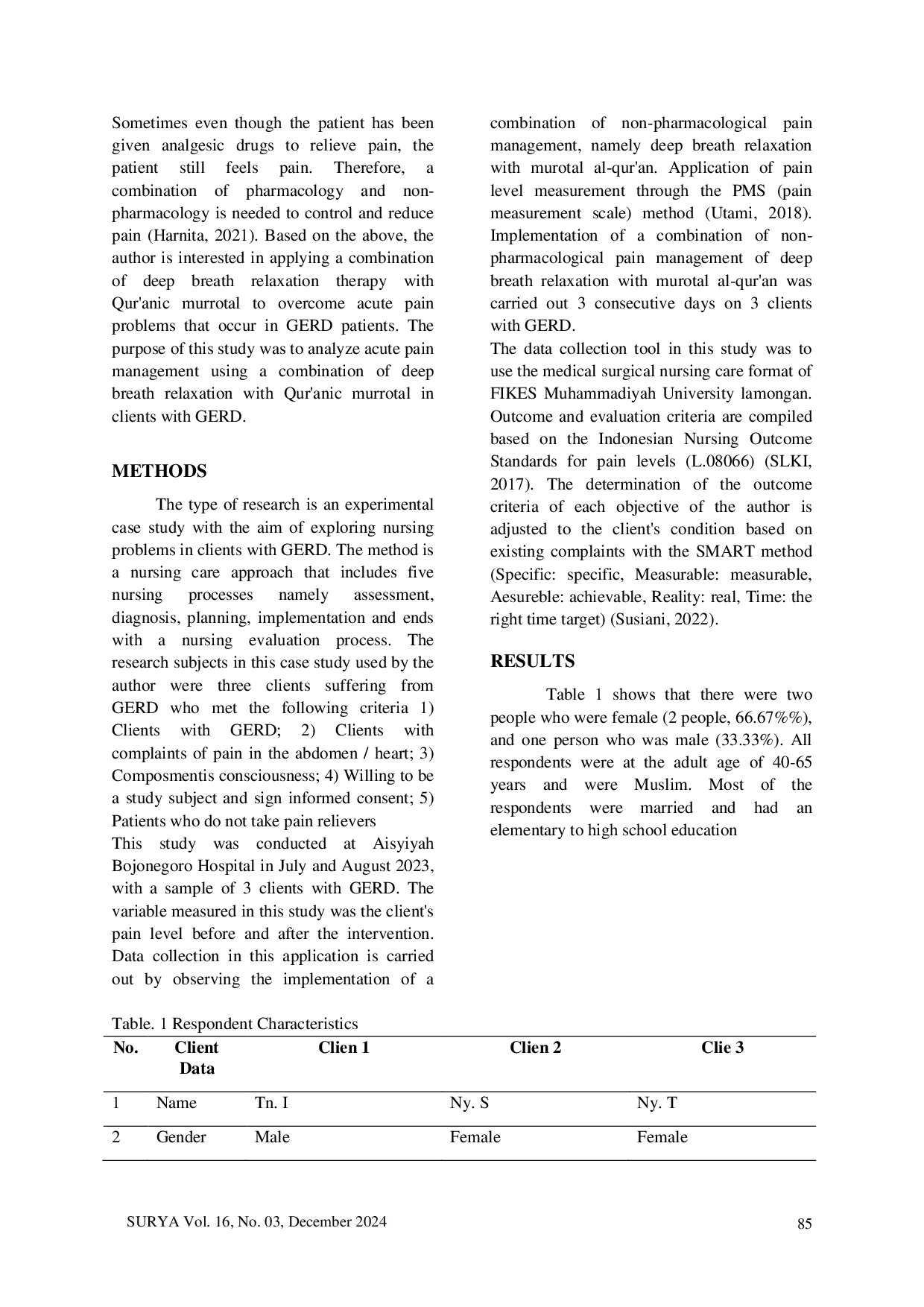 SURYA: Jurnal Media Komunikasi Ilmu KesehatanSURYA: Jurnal Media Komunikasi Ilmu KesehatanIntroduction: GERD is also called a disease that appears in the stomach and causes gastric disorders. The most common symptoms of GERD are a burning sensation in the throat and chest area, a bitter taste on the tongue, and pain in the heart area. The implementation of non-pharmacological deep breathing relaxation therapy using Al-Quran murotals is the basis for carrying out research. The purpose of this paper is to analyze acute pain management in patients with GERD. Methods: A Case study design was used in this study with a sample size of three patients, namely patients with GERD aged 40-65 years at Aisyiyah Bojonegoro Hospital with acute pain nursing problems. The action given to overcome this acute pain by using a combination of deep breath relaxation with Quranic murotal given for 3 consecutive days and the pain scale is measured by a numerical pain scale. Data analysis used uses the SMART method (specific, measurable, achievable, relevant and time-bound goals). Results: The results of the case study on the first day of the three patients felt pain in the abdomen with moderate pain category. The planned nursing intervention action is pain management with pain levels as an outcome criterion. Implementation was carried out for 3 days, the results showed that the patients pain level decreased with a moderate level of pain scale.