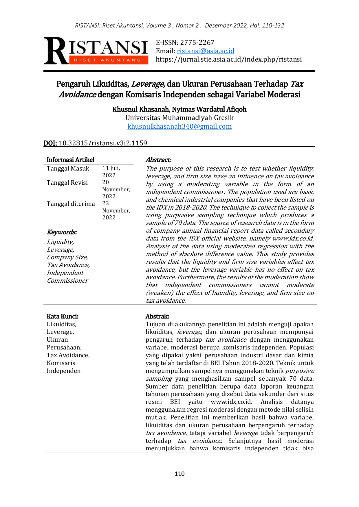 RISTANSI: Riset AkuntansiRISTANSI: Riset AkuntansiThe purpose of this research is to test whether liquidity, leverage, and firm size have an influence on tax avoidance by using a moderating variable in the form of an independent commissioner. The population used are basic and chemical industrial companies that have been listed on the IDX in 2018-2020. The technique to collect the sample is using purposive sampling technique which produces a sample of 70 data. The source of research data is in the form of company annual financial report data called secondary data from the IDX official website, namely www.idx.co.id. Analysis of the data using moderated regression with the method of absolute difference value. This study provides results that the liquidity and firm size variables affect tax avoidance, but the leverage variable has no effect on tax avoidance. Furthermore, the results of the moderation show that independent commissioners cannot moderate (weaken) the effect of liquidity, leverage, and firm size on tax avoidance.