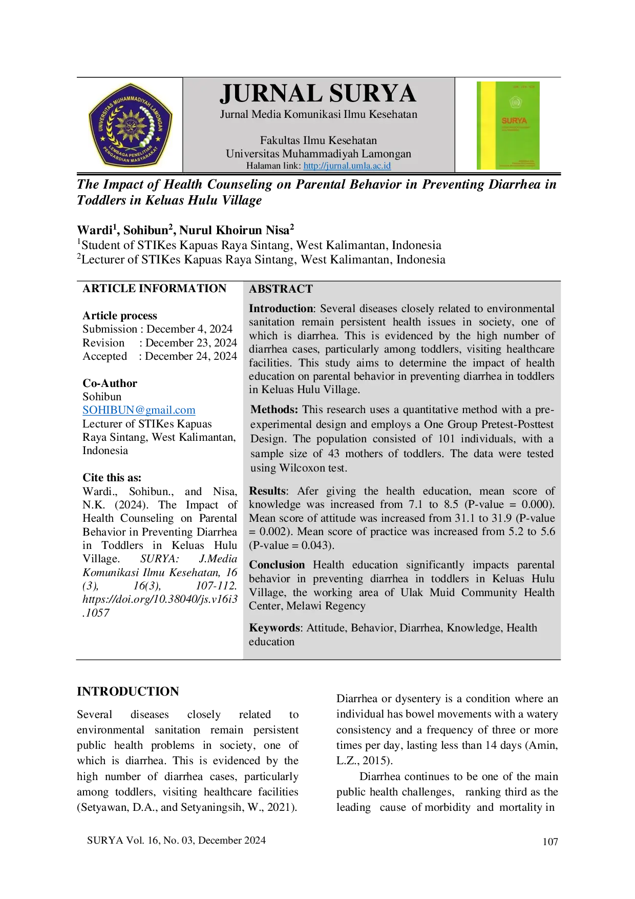 SURYA: Jurnal Media Komunikasi Ilmu KesehatanSURYA: Jurnal Media Komunikasi Ilmu KesehatanSeveral diseases closely related to environmental sanitation remain persistent health issues in society, one of which is diarrhea. This is evidenced by the high number of diarrhea cases, particularly among toddlers, visiting healthcare facilities. This study aims to determine the impact of health education on parental behavior in preventing diarrhea in toddlers in Keluas Hulu Village. This research uses a quantitative method with a pre-experimental design and employs a One Group Pretest-Posttest Design. The population consisted of 101 individuals, with a sample size of 43 mothers of toddlers. The data were tested using Wilcoxon test. Results showed a significant increase in knowledge (P-value = 0.000), attitude (P-value = 0.002), and practice (P-value = 0.043) after health education. In conclusion, health education significantly impacts parental behavior in preventing diarrhea in toddlers in Keluas Hulu Village.
