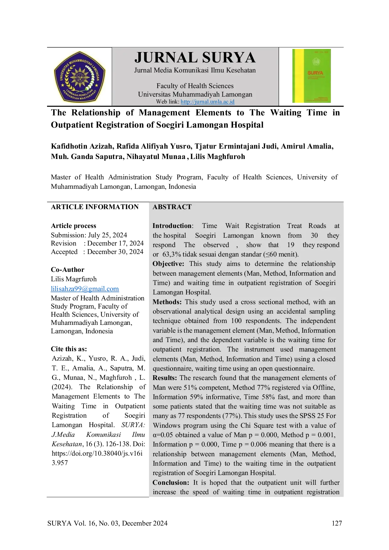 SURYA: Jurnal Media Komunikasi Ilmu KesehatanSURYA: Jurnal Media Komunikasi Ilmu KesehatanPenelitian ini bertujuan untuk menentukan hubungan antara elemen manajemen (Man, Method, Information, dan Time) dengan waktu tunggu pendaftaran rawat jalan di Rumah Sakit Soegiri Lamongan. Metode penelitian yang digunakan adalah cross sectional dengan desain observasional analitik menggunakan teknik accidental sampling terhadap 100 responden. Hasil penelitian menunjukkan bahwa elemen manajemen Man kompeten pada 51%, Method terdaftar secara Offline pada 77%, Information informatif pada 59%, Time cepat pada 58%, dan lebih dari beberapa pasien menyatakan bahwa waktu tunggu tidak sesuai sebanyak 77 responden. Uji Chi Square dengan α=0.05 menunjukkan adanya hubungan signifikan antara elemen manajemen (Man, Method, Information, dan Time) terhadap waktu tunggu pendaftaran rawat jalan di Rumah Sakit Soegiri Lamongan.