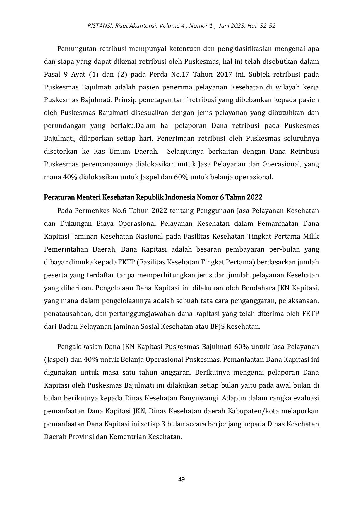 RISTANSI: Riset AkuntansiRISTANSI: Riset AkuntansiPenelitian ini dilakukan untuk menganalisis penerapan PSAP No 13 Tahun 2015 terhadap Penyajian Laporan Keuangan Puskesmas sebagai salah satu bentuk Badan Layanan Umum. Penelitian ini menggunakan metode kualitatif yang bersifat deskriptif dengan pendekatan studi kasus. Penelitian ini menggunakan wawancara yang mendalam kepada Kepala Puskesmas dan Bagian Tata Usaha serta menganalisis Laporan Keuangan objek penelitian. Hasil penelitian menunjukkan bahwa Puskesmas Bajulmati sudah menerapkan PSAP No 13 Tahun 2015 dengan sesuai, Namun dalam pelaksanaanya penyajian laporan keuangan Puskesmas Bajulmati menggunakan Peraturan Bupati Banyuwangi No.40 Tahun 2018, Peraturan Daerah Kabupaten Banyuwangi No.17 Tahun 2107, dan Peraturan Menteri Kesehatan Republik Indonesia No.6 Tahun 2022 sesuai dengan arahan Dinas Kesehatan.