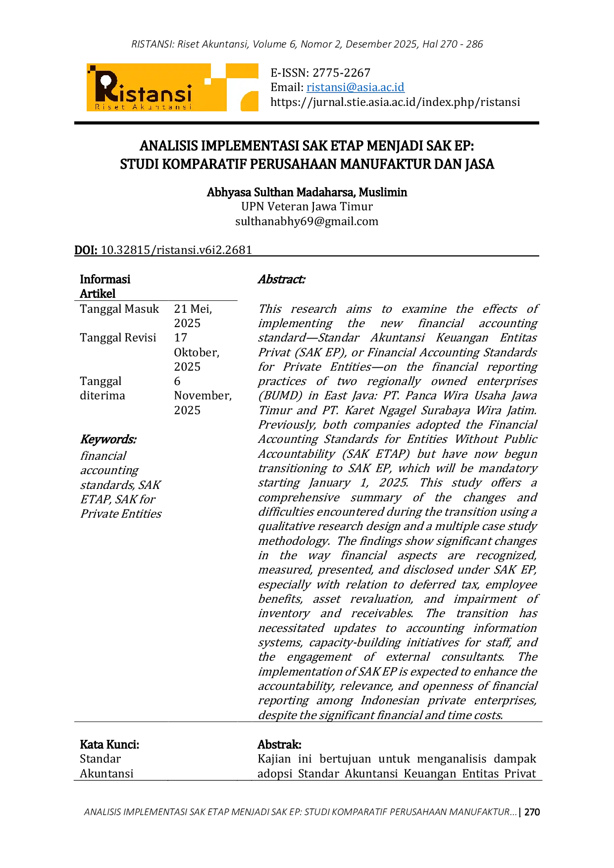 RISTANSI: Riset AkuntansiRISTANSI: Riset AkuntansiKajian ini bertujuan untuk menganalisis dampak adopsi Standar Akuntansi Keuangan Entitas Privat (SAK EP) yang akan berlaku wajib pada 1 Januari 2025 terhadap praktik pelaporan finansial di dua Badan Usaha Milik Daerah (BUMD) Jawa Timur: PT. Panca Wira Usaha dan PT. Karet Ngagel Surabaya Wira Jatim. Penelitian kualitatif studi kasus ganda ini menyajikan analisis deskriptif terkait tantangan dan perubahan signifikan dalam aspek pengakuan, pengukuran, penyajian, dan pengungkapan elemen-elemen keuangan—terlebih pada pajak tangguhan, imbalan kerja, revaluasi aset, serta penyisihan penurunan nilai piutang dan persediaan—yang ditimbulkan oleh transisi dari SAK ETAP ke SAK EP. Hasilnya menegaskan bahwa transisi tersebut menuntut modernisasi sistem informasi akuntansi, peningkatan kompetensi SDM, serta keterlibatan profesional eksternal.