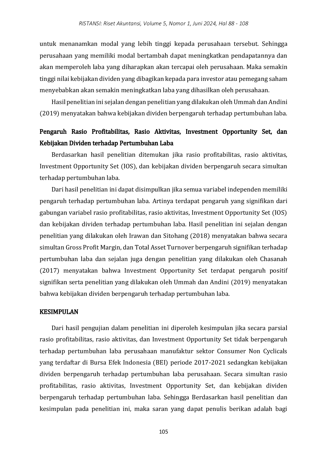 Pertama, perlu diteliti bagaimana pengaruh ukuran perusahaan dan struktur modal terhadap pertumbuhan laba, mengingat variabel-variabel tersebut mungkin menjadi faktor penting yang tidak terjangkau oleh rasio keuangan tradisional. Kedua, sebaiknya dilakukan penelitian dengan menggunakan proksi alternatif untuk rasio profitabilitas, aktivitas, dan Investment Opportunity Set—seperti Net Profit Margin, Inventory Turnover, atau Current Assets to Net Sales—untuk melihat apakah hasilnya berbeda dan lebih signifikan dalam menjelaskan pertumbuhan laba. Ketiga, diperlukan studi lanjutan yang memperluas sampel ke sektor lain di luar consumer non cyclicals, misalnya sektor kesehatan atau teknologi, untuk menguji generalisasi temuan ini dan mengeksplorasi apakah dinamika pertumbuhan laba berbeda di sektor dengan karakteristik pertumbuhan dan risiko yang lebih tinggi.