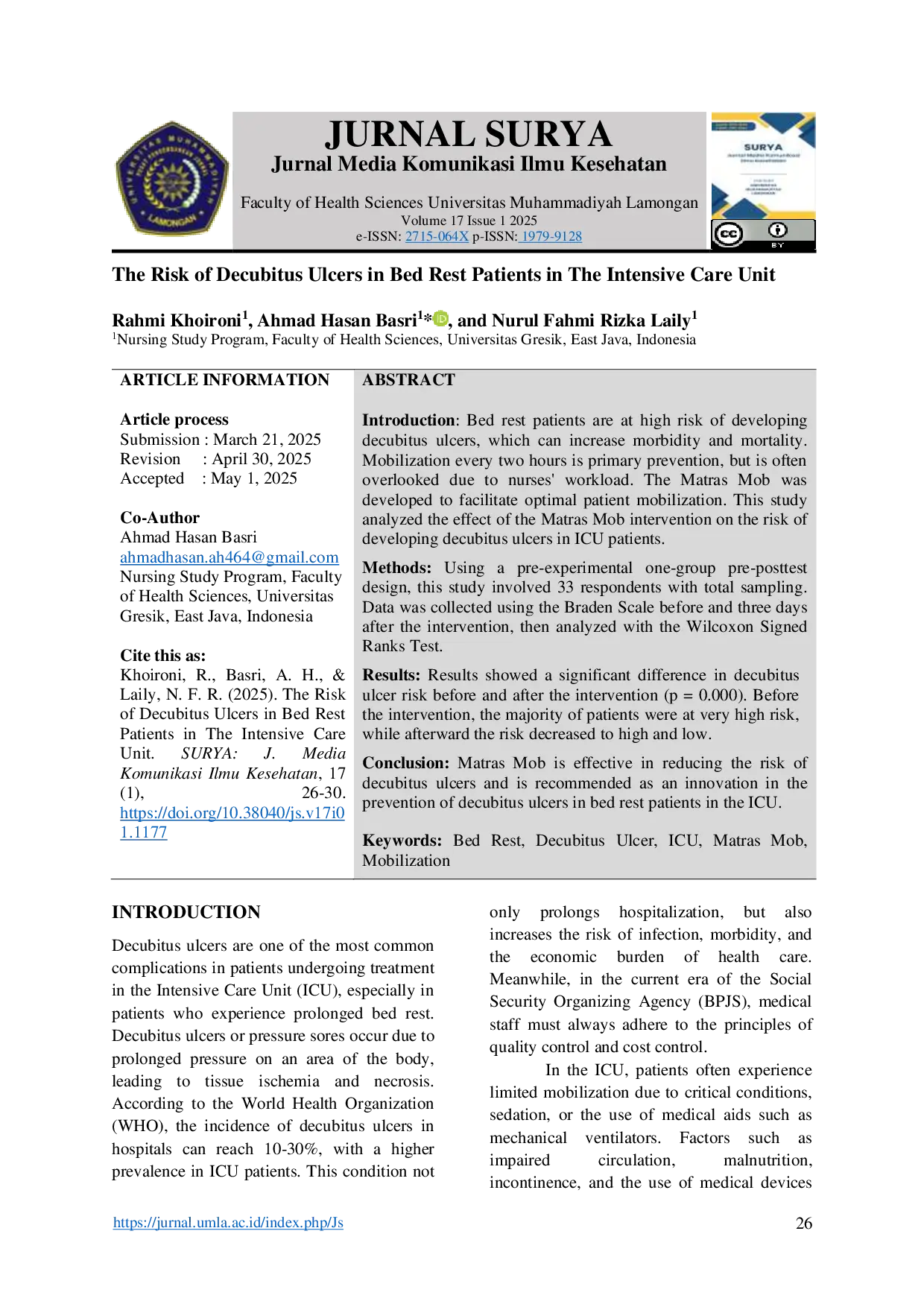 SURYA: Jurnal Media Komunikasi Ilmu KesehatanSURYA: Jurnal Media Komunikasi Ilmu KesehatanArtikel ini membahas risiko ulkus dekubitus pada pasien yang menjalani perawatan di unit perawatan intensif (ICU), terutama mereka yang mengalami tirah baring dalam waktu lama. Ulkus dekubitus atau luka tekanan terjadi akibat tekanan yang berkepanjangan pada area tubuh tertentu, menyebabkan iskemia dan nekrosis. Menurut Organisasi Kesehatan Dunia (WHO), insidensi ulkus dekubitus di rumah sakit dapat mencapai 10-30%, dengan prevalensi yang lebih tinggi pada pasien ICU. Kondisi ini tidak hanya memperpanjang masa rawat inap, tetapi juga meningkatkan risiko infeksi, morbiditas, dan beban ekonomi kesehatan. Penelitian ini menganalisis efektivitas intervensi Matras Mob dalam mengurangi risiko ulkus dekubitus pada pasien ICU.