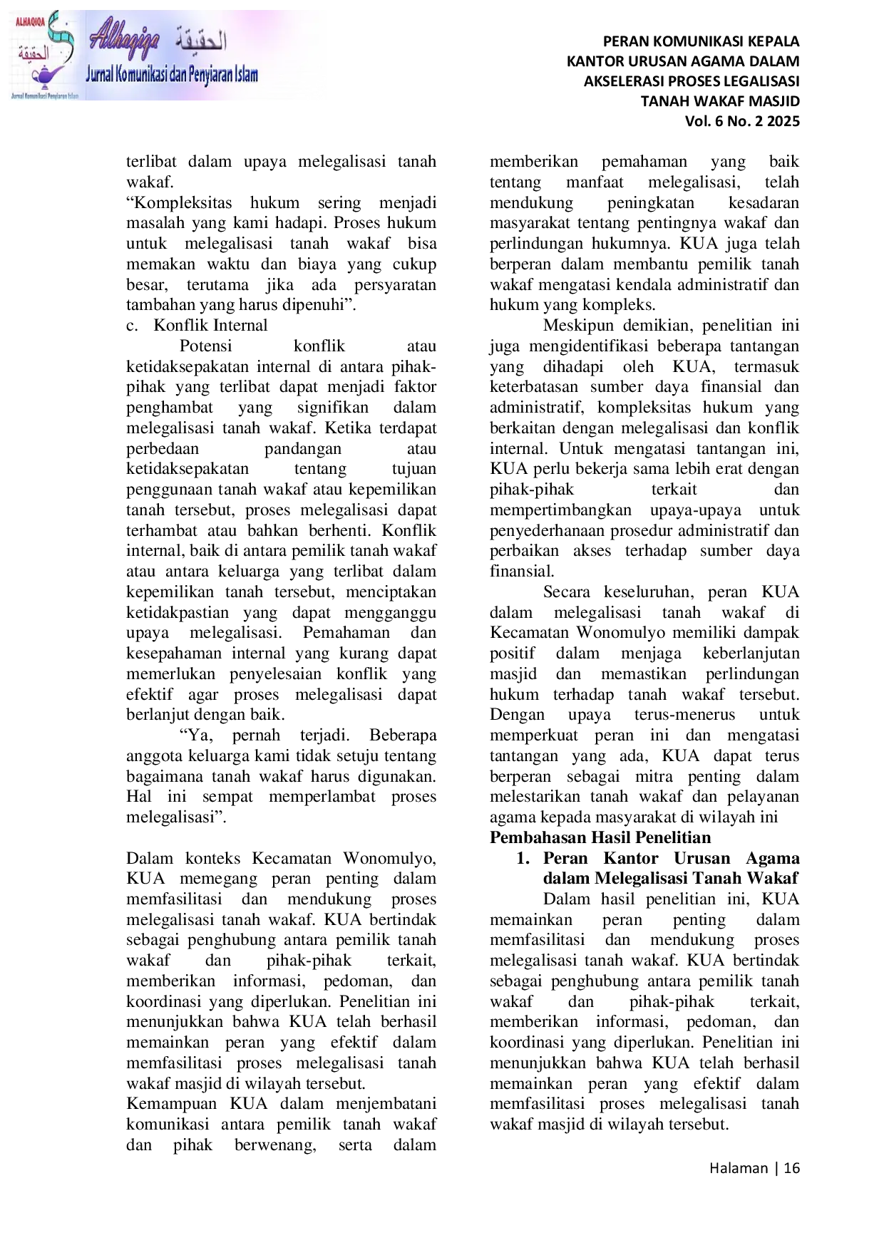 Alhaqiqa: Jurnal Komunikasi dan Penyiaran IslamAlhaqiqa: Jurnal Komunikasi dan Penyiaran IslamWakaf adalah ibadah keuangan yang memberikan keuntungan bagi wāqif berupa pahala berkelanjutan dan berdampak finansial bagi penerimanya. Harta wakaf untuk generasi mendatang harus dikelola baik oleh nazir, yang bertanggung jawab menjaga dan mengelolanya sesuai niat wāqif. Penelitian ini bertujuan 1) untuk mengetahui peran kepala kantor urusan agama dalam melegalisasi tanah wakaf masjid di kecamatan wonomulyo kabupaten polewali mandar 2) untuk mengetahui faktor penghambat dalam melegalisasi tanah wakaf di kecamatan wonomulyo. Hasil penelitian menunjukkan 1) KUA berperan sentral sebagai mediator antara pemilik tanah wakaf dan entitas relevan, mempromosikan kesadaran tentang wakaf, serta mengatasi hambatan administratif dan hukum yang muncul. Dengan demikian, KUA memegang peranan penting dalam penguatan praktek wakaf di wilayah tersebut 2) diidentifikasi tiga faktor utama yang menjadi penghambat proses legalisasi tanah wakaf. Pertama, kurangnya pemahaman masyarakat mengenai konsep dan manfaat wakaf. Kedua, kompleksitas dalam prosedur administratif dan hukum yang terkait. Terakhir, adanya konflik internal yang muncul di antara pemangku kepentingan. Ketiga faktor ini penting untuk diperhatikan dalam upaya meningkatkan efektivitas legalisasi tanah wakaf.
