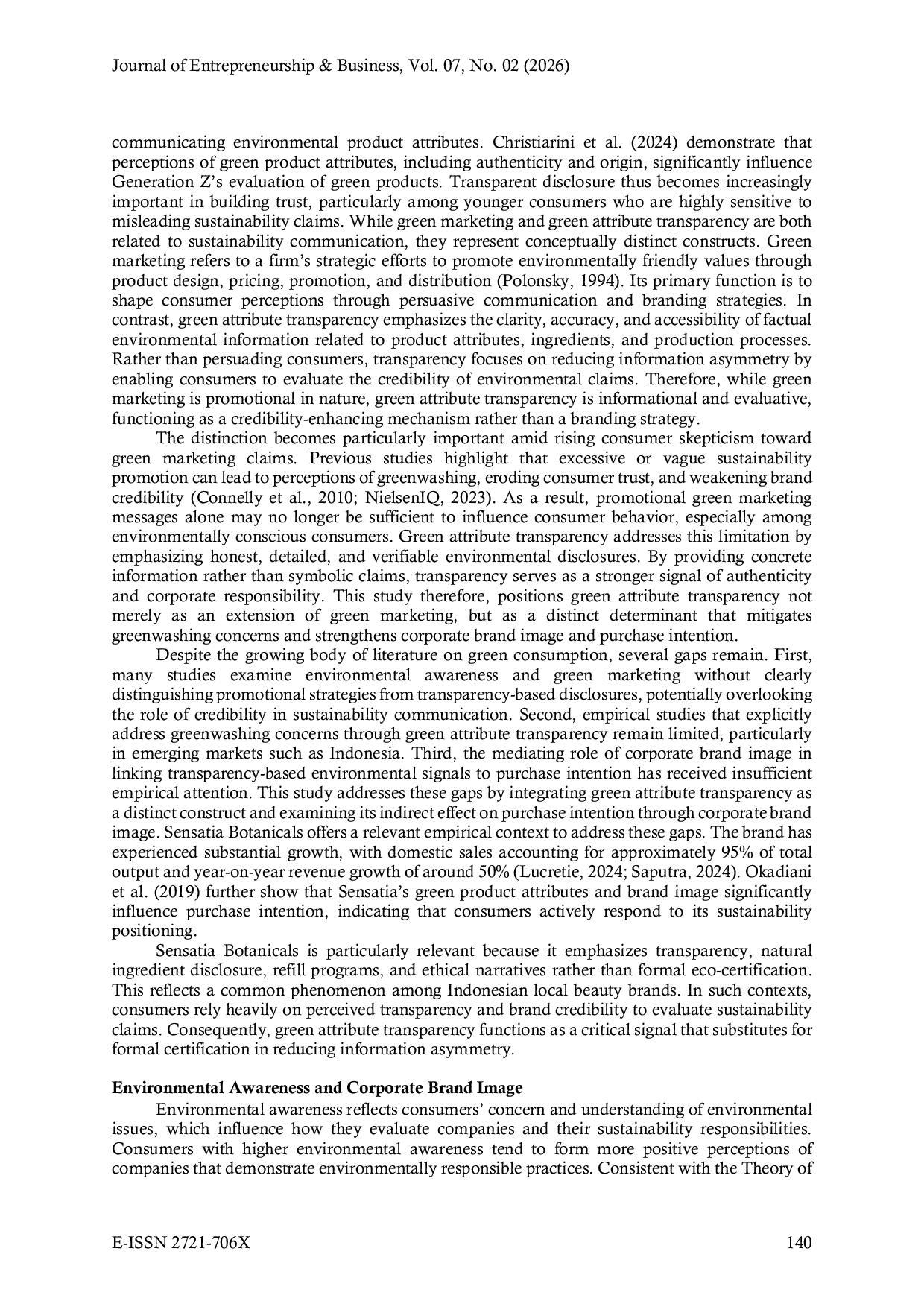 Journal of Entrepreneurship & BusinessJournal of Entrepreneurship & BusinessPenelitian ini bertujuan untuk menganalisis pengaruh kesadaran lingkungan, pemasaran hijau, dan transparansi atribut hijau terhadap niat beli konsumen terhadap produk perawatan pribadi ramah lingkungan, dengan citra merek perusahaan sebagai variabel mediasi. Keunikan penelitian ini terletak pada penekanan transparansi atribut hijau sebagai penentu niat beli yang berbeda dan pemeriksaan peran mediasi citra merek perusahaan dalam konteks merek perawatan pribadi yang berorientasi pada keberlanjutan di Indonesia. Hasil penelitian menunjukkan bahwa kesadaran lingkungan, pemasaran hijau, dan transparansi atribut hijau secara positif memengaruhi niat beli, dengan citra merek perusahaan memainkan peran pendukung dalam membentuk persepsi konsumen. Citra merek perusahaan secara signifikan memediasi efek kesadaran lingkungan dan transparansi atribut hijau pada niat beli, tetapi tidak memediasi hubungan antara pemasaran hijau dan niat beli.