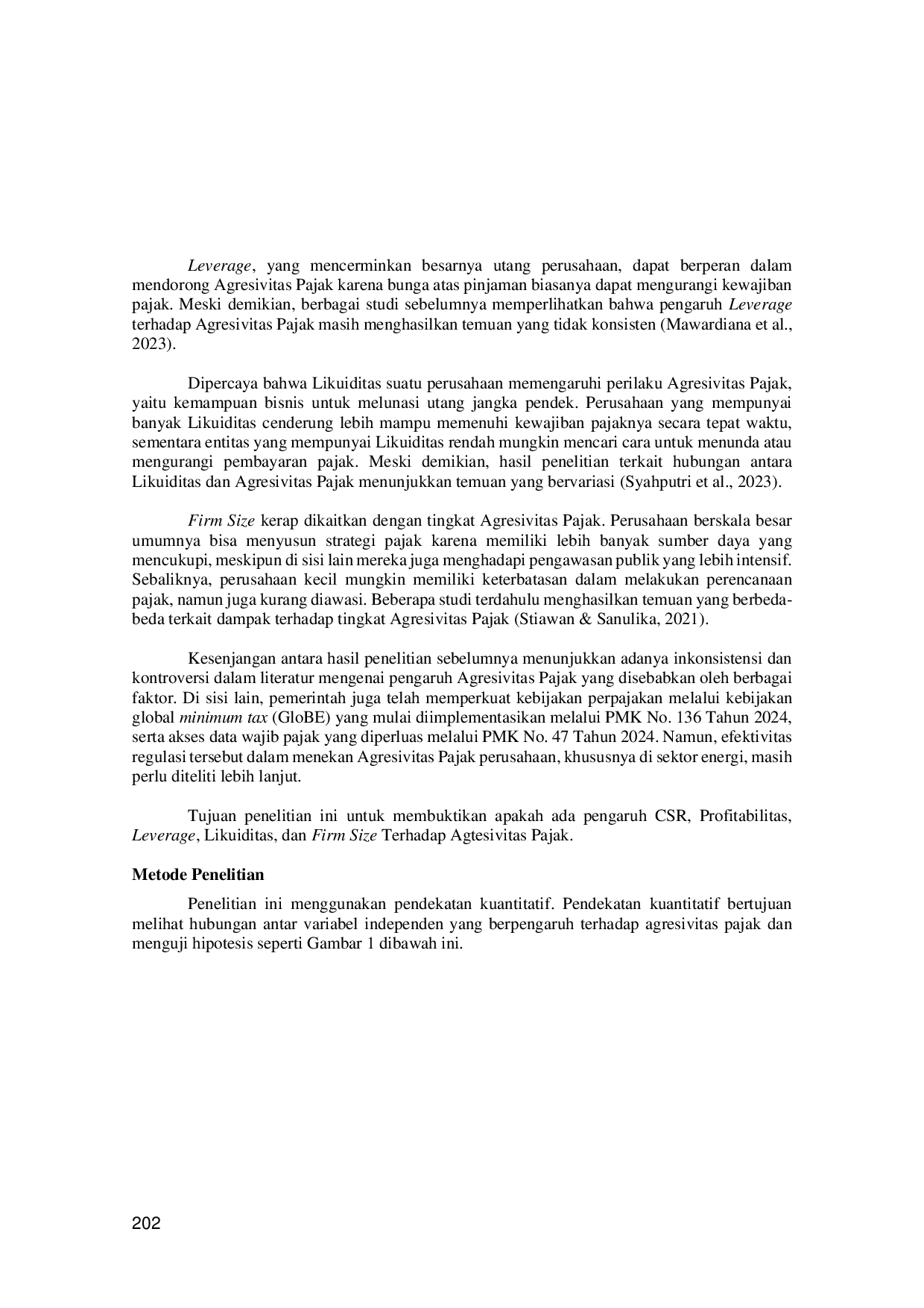 Penelitian ini menyimpulkan bahwa secara parsial, CSR, Profitabilitas, Likuiditas, dan Firm Size tidak berpengaruh signifikan terhadap Agresivitas Pajak, namun Leverage berpengaruh signifikan.Secara simultan, CSR, Profitabilitas, Leverage, Likuiditas, dan Firm Size berpengaruh signifikan terhadap Agresivitas Pajak.Hasil ini menunjukkan bahwa keputusan terkait penghindaran pajak dipengaruhi oleh gabungan berbagai faktor keuangan dan non-keuangan.