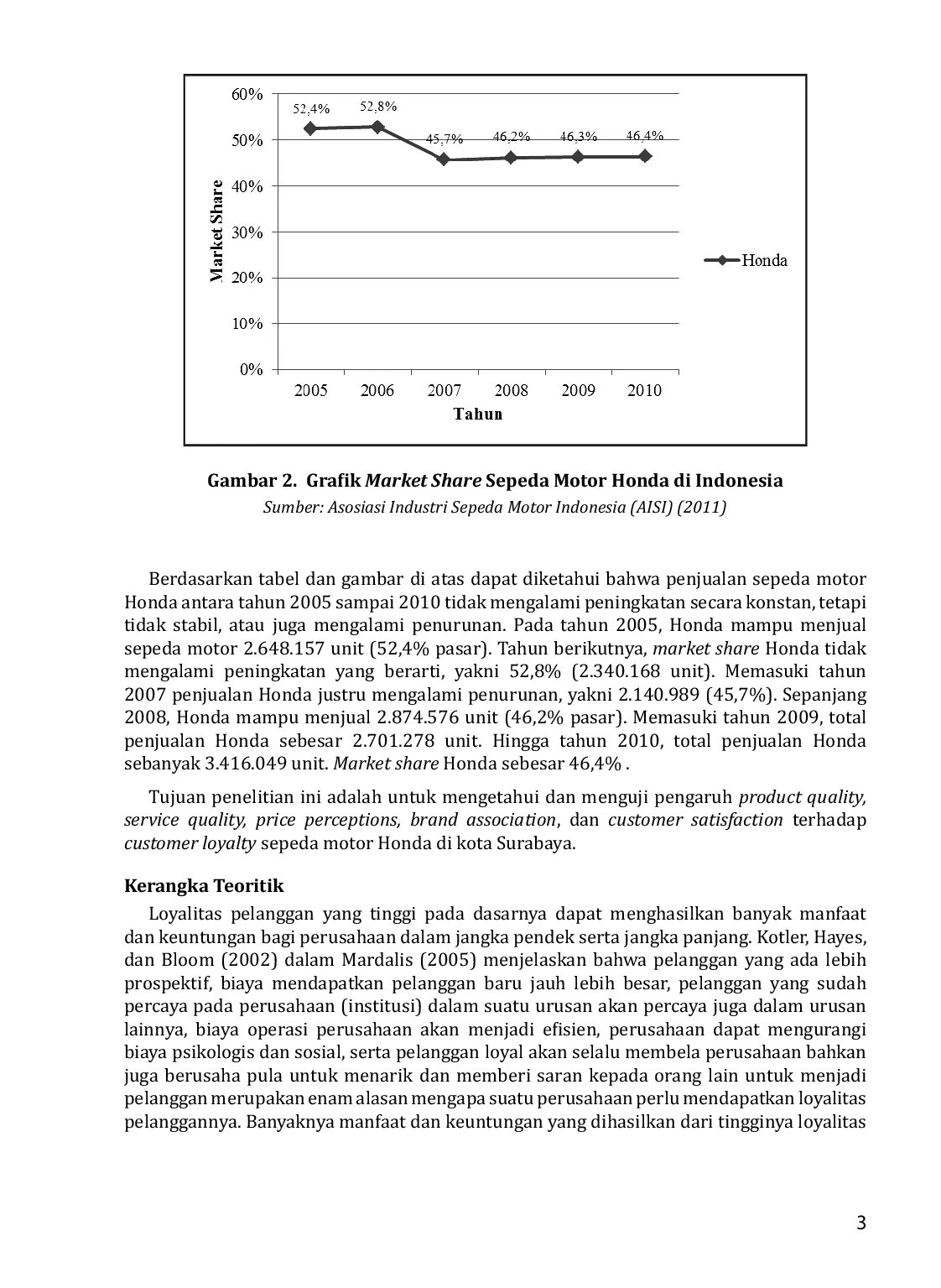 Jurnal Bisnis TerapanJurnal Bisnis TerapanPenelitian ini merupakan studi kasus untuk menjelaskan hubungan kausal antar variabel dalam model penelitian, yaitu kualitas produk, kualitas layanan, persepsi harga, dan asosiasi merek terhadap kepuasan pelanggan serta loyalitas pelanggan. Penelitian dilakukan dengan menyebarkan kuesioner kepada 130 responden yang memiliki dua atau lebih sepeda motor Honda dalam lima tahun terakhir di Surabaya, kemudian data diolah menggunakan metode Structural Equation Modeling (SEM) dengan bantuan perangkat lunak AMOS 20.0. Hasil penelitian menunjukkan bahwa pengaruh langsung kualitas produk terhadap loyalitas pelanggan sebesar 0,270, sedangkan pengaruh tidak langsung melalui mediasi kepuasan pelanggan sebesar 0,102. Nilai pengaruh langsung lebih besar daripada pengaruh tidak langsung. Tidak terdapat pengaruh langsung kualitas layanan terhadap loyalitas pelanggan karena nilainya sangat kecil, yaitu 0,065, begitu pula pengaruh tidak langsung melalui kepuasan pelanggan yang juga sangat kecil, yaitu 0,049. Pengaruh langsung persepsi harga terhadap loyalitas pelanggan sebesar 0,236, sedangkan pengaruh tidak langsung melalui kepuasan pelanggan sebesar 0,064. Pengaruh langsung asosiasi merek terhadap loyalitas pelanggan sebesar 0,318, sedangkan pengaruh tidak langsung melalui kepuasan pelanggan sebesar 0,041.