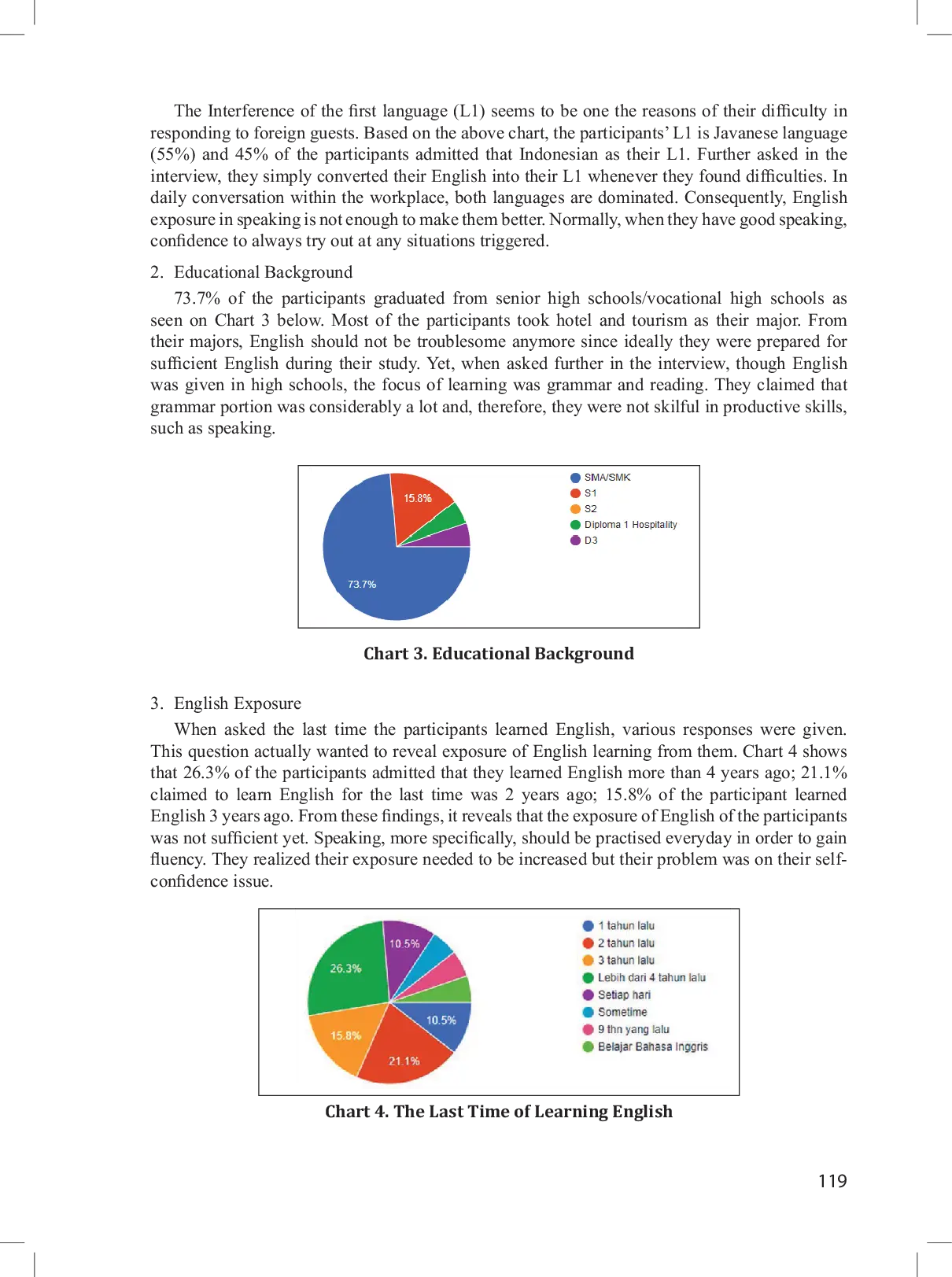 Sebagai kota MICE (Meeting, Incentive, Convention, and Exhibition), Surabaya telah menjadi pilihan strategis bagi siapa pun yang mencari kesenangan atau bisnis sejak perkembangannya telah berkilau selama dekade terakhir.Daya tarik ini telah mendorong kapitalis untuk berinvestasi dalam industri perhotelan dan akibatnya, jumlah hotel di Surabaya telah meningkat pesat.Karena persaingan yang ketat di antara industri perhotelan, pelayanan yang sangat baik harus menjadi isu utama bagi pemimpin hotel dan mereka yang menjadi wajah hotel.Studi ini menunjukkan bahwa staf lini depan perlu meningkatkan kemampuan bahasa Inggris mereka, terutama dalam keterampilan komunikasi lisan, untuk memberikan kesan pertama yang positif dan memenuhi harapan tamu.