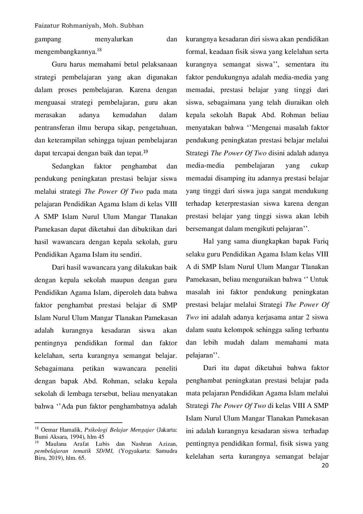 UIM | AHSANA MEDIA: Jurnal Pemikiran, Pendidikan dan Penelitian Ke-IslamanUIM | AHSANA MEDIA: Jurnal Pemikiran, Pendidikan dan Penelitian Ke-IslamanStrategi the power of two adalah aktivitas belajar untuk mendorong pembelajaran dan memperkuat arti penting sinergi dua orang dengan prinsip bahwa berpikir bersama lebih baik daripada berpikir sendiri. Strategi ini akan sangat efektif jika guru mengkondisikan siswa untuk aktif dan ada hubungan dinamis serta saling mendukung antara siswa. Penelitian ini menggunakan pendekatan kualitatif dengan sumber data diperoleh melalui observasi, wawancara, dan dokumentasi. Hasil penelitian menunjukkan bahwa pelaksanaan pembelajaran strategi the power of two menunjukkan proses belajar mengajar di SMP Islam Nurul Ulum sudah berjalan secara aktif. Faktor pendukung dalam meningkatkan prestasi belajar siswa adalah pengalaman serta pengetahuan luas yang dimiliki oleh guru, sedangkan faktor penghambatnya adalah siswa tidak memperhatikan guru saat menjelaskan ulang dan sering diam saat berdiskusi.