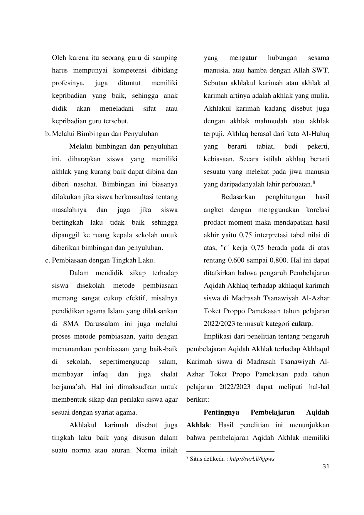 UIM | AHSANA MEDIA: Jurnal Pemikiran, Pendidikan dan Penelitian Ke-IslamanUIM | AHSANA MEDIA: Jurnal Pemikiran, Pendidikan dan Penelitian Ke-IslamanPermasalahan yang menjadi pokok penelitian adalah tentang pengaruh dan besaran pengaruh pembelajaran Aqidah Akhlaq terhadap Akhlaqul Karimah Siswa di MTs Al-Azhar Toket Proppo Pamekasan? Penelitian ini menggunakan pendekatan kuantitatif dengan analisis menggunakan rumus product moment, konfirmasi data dilakukan melalui wawancara dan observasi. Wawancara dilakukan kepada guru Aqidah Akhlah. Penyebaran angket ditujukan kepada 56 orang siswa. Dalam pengumpulan data, baik wawancara, observasi maupun penyebaran angket berjalan dengan lancar, seluruh pertanyaan yang diajukan dapat dijawab sesuai dengan kondisi dan kenyataan yang sebenarnya di MTs Al-Azhar sehingga data yang terkumpul dapat dijadikan sebagai sumber yang akurat dalam penulisan skripsi ini. Hasil penelitian ini menunjukkan bahwa, pertama ada pengaruh pembelajaran Aqidah Akhlaq terhadap Akhlaqul Karimah Siswa di Madrasah Tsanawiyah Al-Azhar. Hal itu dibuktikan nilai r kerja sebesar 0,75 lebih besar dibandingkan dengan r tabel product moment baik taraf signifikasi 5% yaitu 0,263 maupun 1% yaitu 0,342, Kedua, Pembelajaran Aqidah Akhlaq cukup berpengaruh terhadap akhlaqul karimah siswa di MTs Al-Azhar hal ini dibuktikan r kerja 0,75 berada pada rentang 0,600 sampai 0,800 dengan interpretasi Cukup. Implikasi dari penelitian ini adalah: a) Pentingnya Pembelajaran Aqidah Akhlak, b) Pengembangan Materi Pembelajaran, c) Penguatan Pelatihan Guru, d) Pengembangan Kegiatan Ekstrakurikuler, e) Kolaborasi dengan Orang Tua dan Masyarakat.