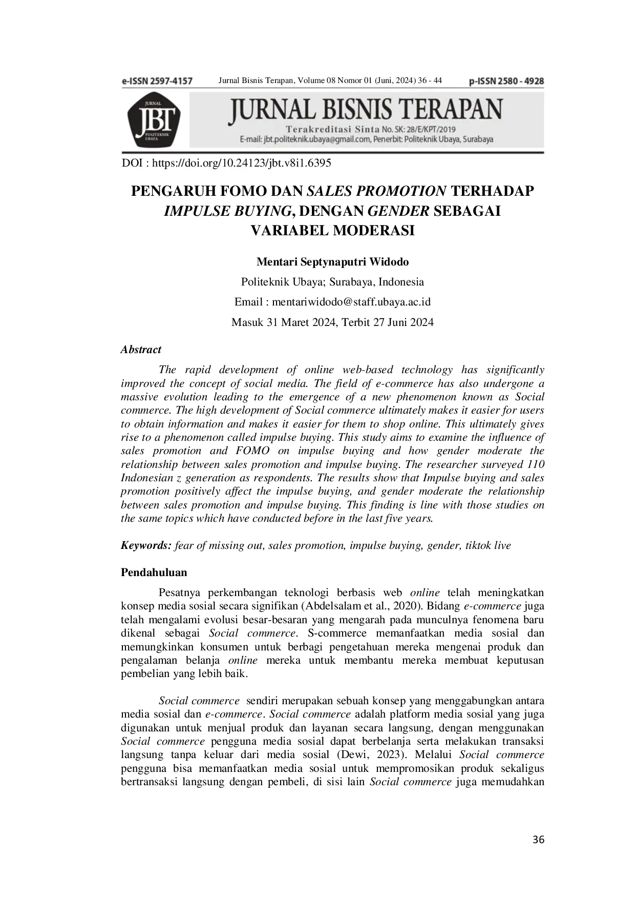 Penelitian ini menyimpulkan bahwa Fear of Missing Out (FOMO) secara signifikan memengaruhi impulse buying, dan promosi penjualan juga berpengaruh signifikan terhadap impulse buying.Selain itu, gender terbukti memoderasi hubungan antara promosi penjualan dan impulse buying.Temuan ini menunjukkan bahwa tingkat ketakutan ketinggalan tren dan promosi yang menarik dapat mendorong pembelian impulsif, dan pengaruh ini dapat bervariasi antara laki-laki dan perempuan.