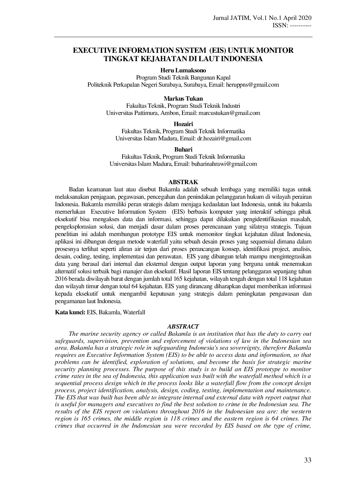 UIM | Jurnal Aplikasi Teknologi Informasi dan Manajemen (JATIM)UIM | Jurnal Aplikasi Teknologi Informasi dan Manajemen (JATIM)Badan keamanan laut atau disebut Bakamla adalah sebuah lembaga yang memiliki tugas untuk melaksanakan penjagaan, pengawasan, pencegahan dan penindakan pelanggaran hukum di wilayah perairan Indonesia. Bakamla memiliki peran strategis dalam menjaga kedaulatan laut Indonesia, untuk itu Bakamla memerlukan Executive Information System (EIS) berbasis komputer yang interaktif sehingga pihak eksekutif bisa mengakses data dan informasi, sehingga dapat dilakukan pengidentifikasian masalah, pengeksplorasian solusi, dan menjadi dasar dalam proses perencanaan yang bersifat strategis. Tujuan penelitian ini adalah membangun prototipe EIS untuk memonitor tingkat kejahatan di laut Indonesia, aplikasi ini dibangun dengan metode waterfall yaitu sebuah desain proses yang sekuensial dimana dalam prosesnya terlihat seperti aliran air terjun dari proses perancangan konsep, identifikasi proyek, analisis, desain, coding, testing, implementasi dan perawatan. EIS yang dibangun telah mampu mengintegrasikan data yang berasal dari internal dan eksternal dengan output laporan yang berguna untuk menemukan alternatif solusi terbaik bagi manajer dan eksekutif. Hasil laporan EIS tentang pelanggaran sepanjang tahun 2016 berada di wilayah barat dengan jumlah total 165 kejahatan, wilayah tengah dengan total 118 kejahatan dan wilayah timur dengan total 64 kejahatan. EIS yang dirancang diharapkan dapat memberikan informasi kepada eksekutif untuk mengambil keputusan yang strategis dalam peningkatan pengawasan dan pengamanan laut Indonesia.