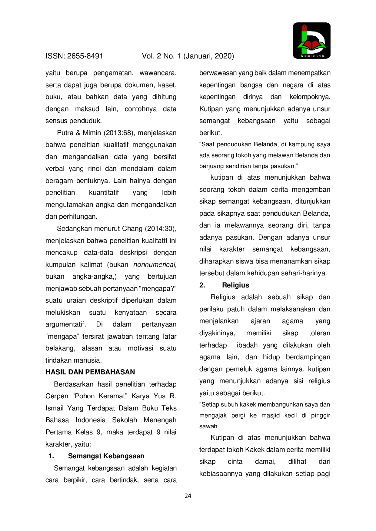 IdealektikIdealektikKarya sastra Indonesia mengandung banyak pesan moral yang tinggi, yang tentunya dapat menjadi media untuk menggerakkan dan mengangkat harkat manusia pada tingkat tertinggi. Pembelajaran sastra tidak hanya bersifat teoritis, namun juga mencakup aplikasinya. Salah satu manfaat pengajaran sastra adalah menanamkan nilai pendidikan karakter pada peserta didik. Nilai-nilai karakter tersebut menurut Kemendiknas meliputi religius, jujur, toleransi, disiplin, kerja keras, kreatif, mandiri, demokratis, rasa ingin tahu, semangat kebangsaan, cinta tanah air, menghargai prestasi, bersahabat/komunikatif, cinta damai, gemar membaca, peduli lingkungan, peduli sosial, dan tanggung jawab. Penelitian ini menggunakan metode kualitatif. Hasil penelitian terhadap cerpen Pohon Keramat karya Yus R. Ismail dalam buku teks Bahasa Indonesia SMP Kelas 9 menunjukkan terdapat sembilan nilai karakter, yaitu: (1) Semangat Kebangsaan, (2) Religius, (3) Cinta Damai, (4) Toleransi, (5) Bersahabat/Komunikatif, (6) Kreatif, (7) Peduli Lingkungan, (8) Disiplin, dan (9) Menghargai Prestasi.
