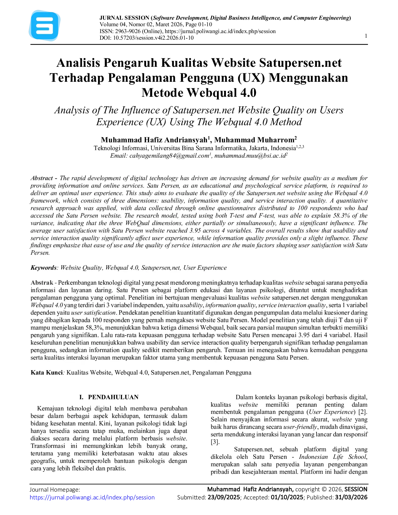 Penelitian ini menyimpulkan bahwa secara umum pengguna merasa puas dengan pengalaman mereka di website Satupersen.Persepsi pengguna terhadap pengalaman pengguna (UX) pada website Satupersen.net secara signifikan dipengaruhi oleh variabel-variabel Webqual 4.Ketiga variabel kualitas website menunjukkan performa yang baik dan berpengaruh positif terhadap pengalaman pengguna secara komprehensif.