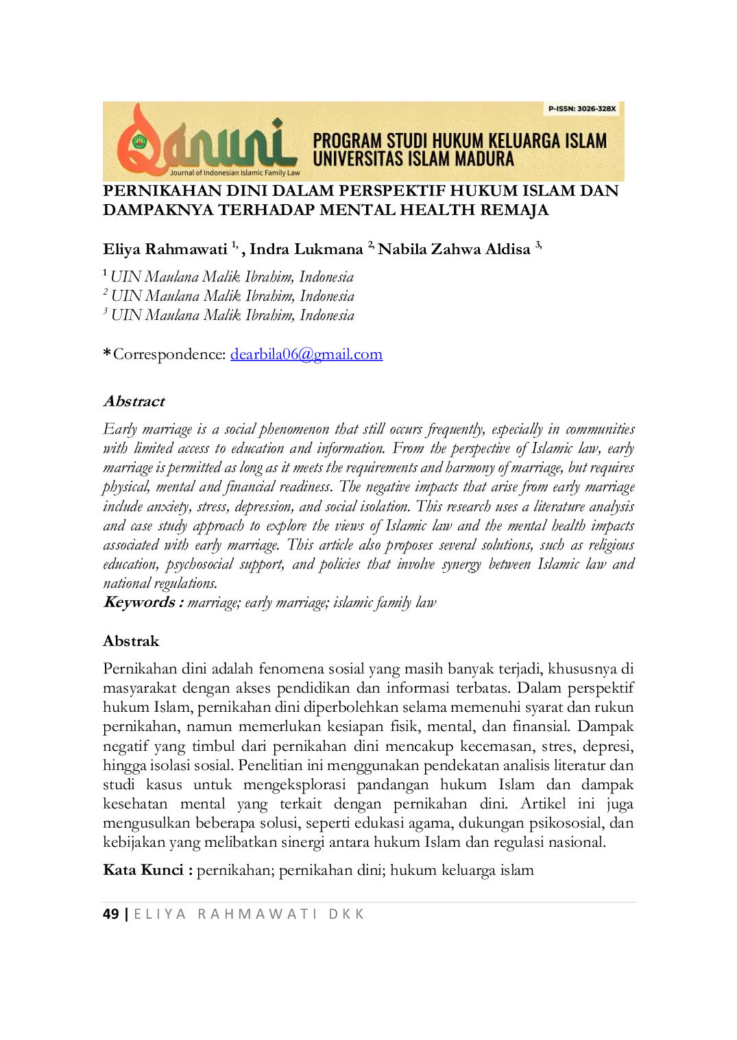 UIM | Qanuni : Journal of Indonesian Islamic Family LawUIM | Qanuni : Journal of Indonesian Islamic Family LawPernikahan dini adalah fenomena sosial yang masih banyak terjadi, khususnya di masyarakat dengan akses pendidikan dan informasi terbatas. Dalam perspektif hukum Islam, pernikahan dini diperbolehkan selama memenuhi syarat dan rukun pernikahan, namun memerlukan kesiapan fisik, mental, dan finansial. Dampak negatif yang timbul dari pernikahan dini mencakup kecemasan, stres, depresi, hingga isolasi sosial. Penelitian ini menggunakan pendekatan analisis literatur dan studi kasus untuk mengeksplorasi pandangan hukum Islam dan dampak kesehatan mental yang terkait dengan pernikahan dini. Artikel ini juga mengusulkan beberapa solusi, seperti edukasi agama, dukungan psikososial, dan kebijakan yang melibatkan sinergi antara hukum Islam dan regulasi nasional.