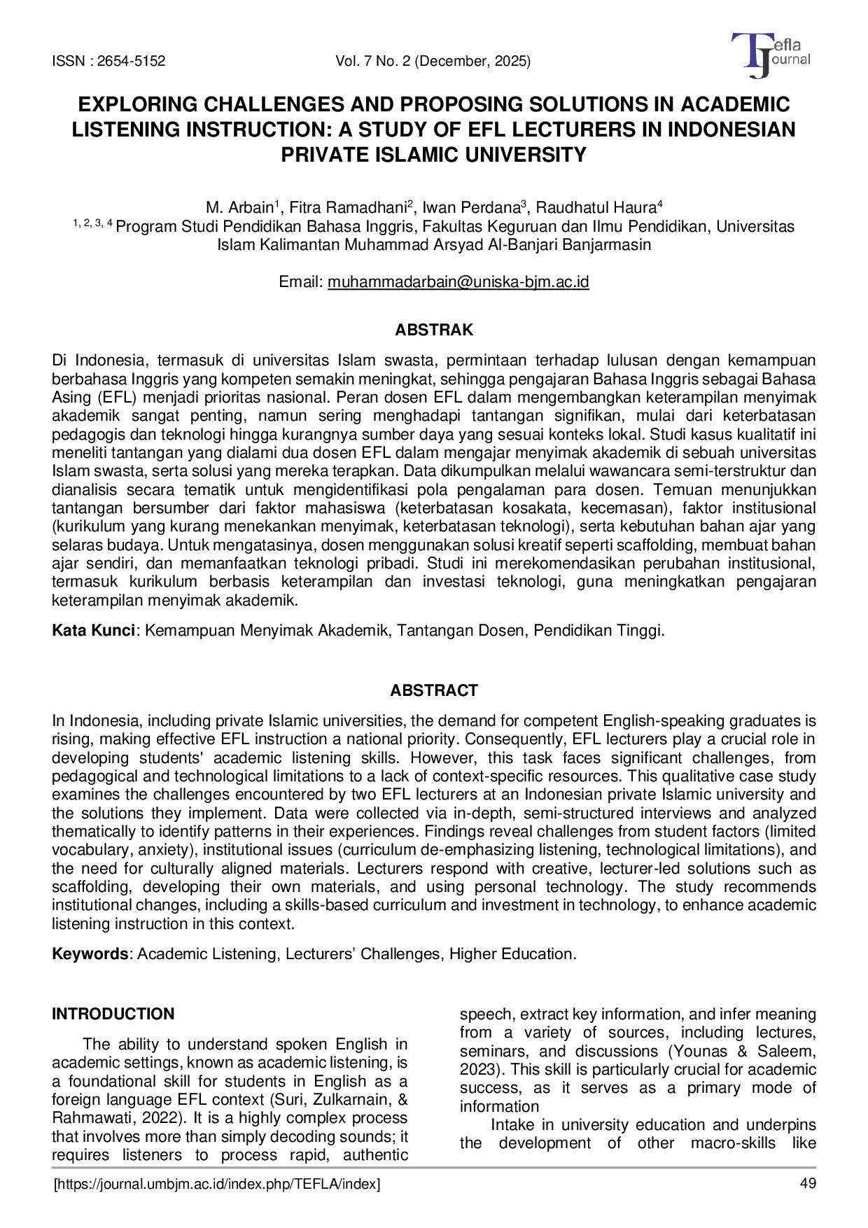 Tefla Journal (Teaching English as Foreign Language and Applied Linguistics Journal)Tefla Journal (Teaching English as Foreign Language and Applied Linguistics Journal)Di Indonesia, termasuk di universitas Islam swasta, permintaan terhadap lulusan dengan kemampuan berbahasa Inggris yang kompeten semakin meningkat, sehingga pengajaran Bahasa Inggris sebagai Bahasa Asing (EFL) menjadi prioritas nasional. Peran dosen EFL dalam mengembangkan keterampilan menyimak akademik sangat penting, namun sering menghadapi tantangan signifikan, mulai dari keterbatasan pedagogis dan teknologi hingga kurangnya sumber daya yang sesuai konteks lokal. Studi kasus kualitatif ini meneliti tantangan yang dialami dua dosen EFL dalam mengajar menyimak akademik di sebuah universitas Islam swasta, serta solusi yang mereka terapkan. Data dikumpulkan melalui wawancara semi-terstruktur dan dianalisis secara tematik untuk mengidentifikasi pola pengalaman para dosen. Temuan menunjukkan tantangan bersumber dari faktor mahasiswa (keterbatasan kosakata, kecemasan), faktor institusional (kurikulum yang kurang menekankan menyimak, keterbatasan teknologi), serta kebutuhan bahan ajar yang selaras budaya. Untuk mengatasinya, dosen menggunakan solusi kreatif seperti scaffolding, membuat bahan ajar sendiri, dan memanfaatkan teknologi pribadi. Studi ini merekomendasikan perubahan institusional, termasuk kurikulum berbasis keterampilan dan investasi teknologi, guna meningkatkan pengajaran keterampilan menyimak akademik.