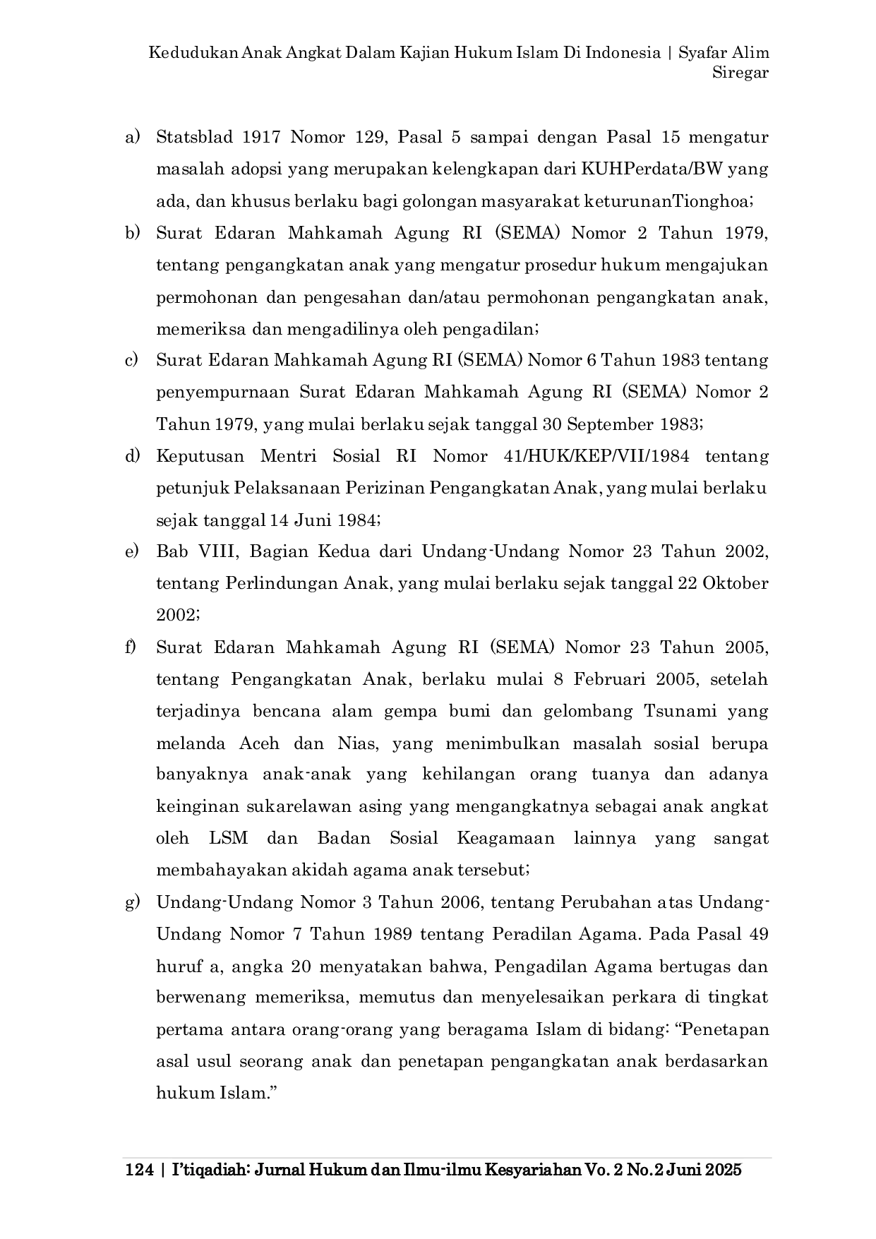 I’tiqadiah: Jurnal Hukum dan Ilmu-ilmu KesyariahanI’tiqadiah: Jurnal Hukum dan Ilmu-ilmu KesyariahanAdopsi atau yang juga biasa disebut sebagai adopsi adalah bentuk tindakan hukum yang memiliki dampak penting terhadap beberapa status hukum pihak-pihak yang terlibat di dalamnya. Penilaian mengenai pengangkatan anak tidak ditemukan dalam beberapa literatur fiqh klasik sebagai pembahasan terpisah, sehingga seolah-olah penilaian tentang masalah ini tidak begitu penting - setidaknya tidak dalam kodifikasi fiqh klasik. Mengacu pada kondisi aktual saat ini, lembaga adopsi adalah salah satu lembaga yang perlu lebih, mengingat banyaknya dampak signifikan yang dapat ditimbulkan. Penelitian ini merupakan studi normatif mengenai hukum dan peraturan di beberapa negara yang berkaitan dengan adopsi. Untuk tujuan analisis, penulis menggunakan pendekatan sosio-yuridis dan historis sehingga diharapkan dapat menggambarkan arah pengembangan sistem hukum di beberapa negara.