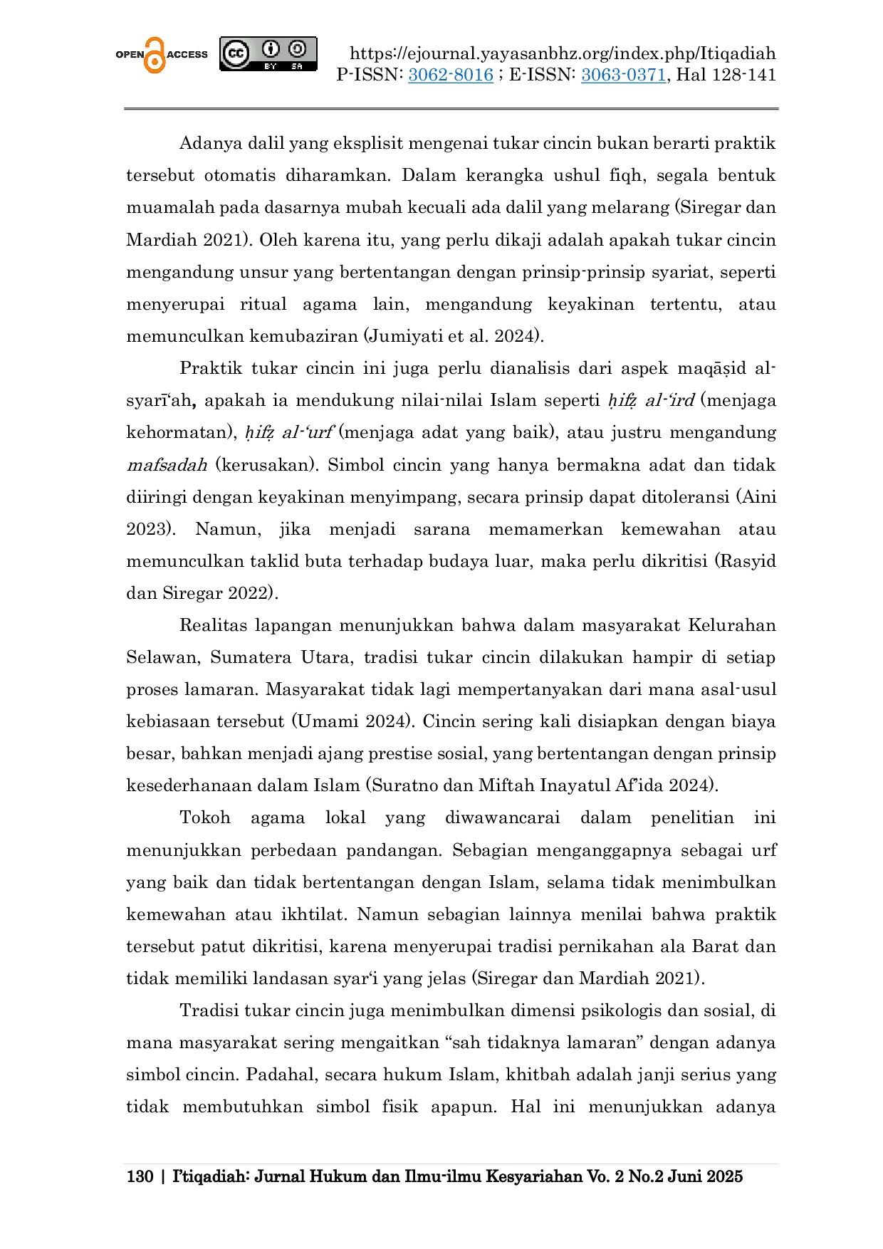 I’tiqadiah: Jurnal Hukum dan Ilmu-ilmu KesyariahanI’tiqadiah: Jurnal Hukum dan Ilmu-ilmu KesyariahanArtikel ini mengkaji fenomena tukar cincin dalam prosesi khitbah (lamaran) sebagai bagian dari tradisi pernikahan Muslim di tengah masyarakat kontemporer. Praktik ini telah mengakar kuat dalam budaya lokal, namun masih menyisakan pertanyaan dari sudut pandang hukum Islam: apakah ia dapat dibenarkan secara syari atau justru mengandung unsur tasyabbuh (penyerupaan) terhadap budaya non-Islam? Penelitian ini menggunakan pendekatan kualitatif dengan metode studi lapangan, yang dilaksanakan di Kelurahan Selawan, Sumatera Utara. Data dikumpulkan melalui observasi, wawancara mendalam dengan pasangan, tokoh agama, dan tokoh adat, serta dokumentasi prosesi khitbah di masyarakat. Hasil penelitian menunjukkan bahwa tradisi tukar cincin dipandang sebagai simbol pengikat komitmen, namun tidak memiliki dasar syariat secara eksplisit. Sebagian tokoh agama menilai praktik ini sebagai adat yang boleh dilakukan selama tidak mengandung unsur yang bertentangan dengan prinsip Islam, seperti israf (berlebih-lebihan) atau keyakinan tertentu yang menyimpang. Tradisi ini mencerminkan dialektika antara budaya dan agama, serta menunjukkan perlunya pendekatan kontekstual dalam merespons dinamika simbolik dalam kehidupan Muslim modern. Penelitian ini menawarkan perspektif integratif antara nilai adat, fikih muamalah, dan etika Islam dalam memahami praktik sosial-keagamaan yang terus berkembang.