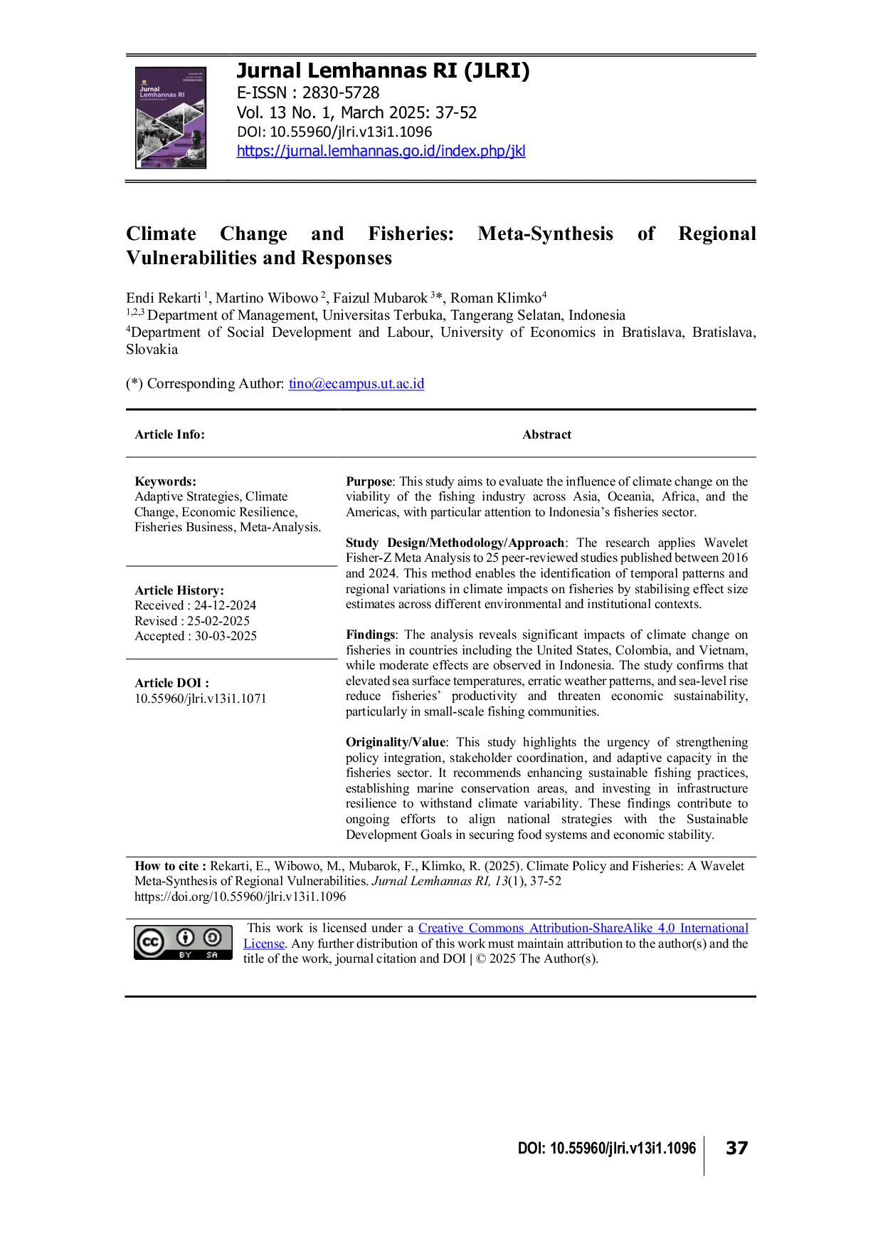 - Climate Change and Fisheries: Meta-Synthesis of Regional Vulnerabilities and Responses | Jurnal Lemhannas... doi.org/10.55960/jlri.v13i1.1096Climate Change and Fisheries Meta Synthesis of Regional Vulnerabilities and Responses Jurnal Lemhannas doi 10 55960 jlri v13i1 1096