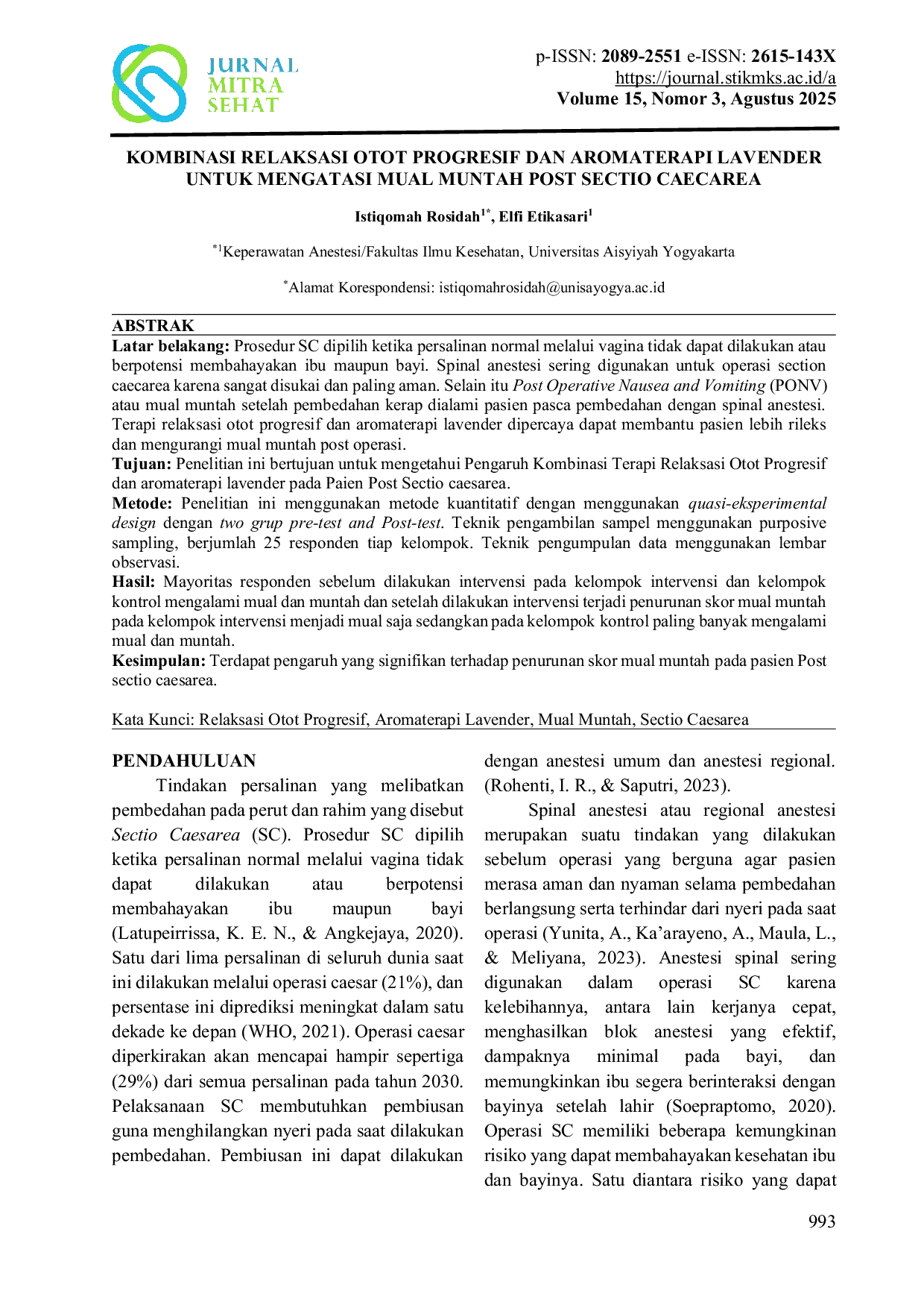 Jurnal MitrasehatJurnal MitrasehatLatar belakang: Prosedur SC dipilih ketika persalinan normal melalui vagina tidak dapat dilakukan atau berpotensi membahayakan ibu maupun bayi. Spinal anestesi sering digunakan untuk operasi section caesarea karena sangat disukai dan paling aman. Selain itu Post Operative Nausea and Vomiting (PONV) atau mual muntah setelah pembedahan kerap dialami pasien pasca pembedahan dengan spinal anestesi. Terapi relaksasi otot progresif dan aromaterapi lavender dipercaya dapat membantu pasien lebih rileks dan mengurangi mual muntah post operasi.