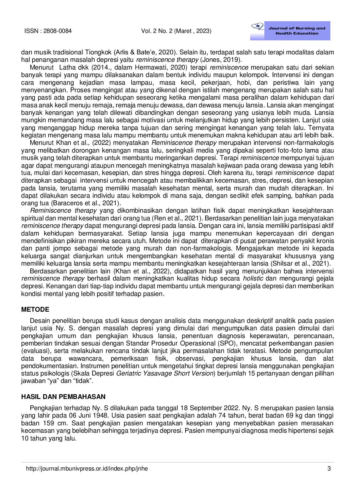 Journal of Nursing and Health EducationJournal of Nursing and Health EducationElderly is a group that is vulnerable to health problems both physically and mentally. Psychological problems that are prone to occur in the elderly are depression. Family support by creating warmth through communication can help minimize depression problems that occur in the elderly. Reminiscence therapy is a modality therapy for depression problems in the form of non-pharmacological interventions involving the encouragement of past memories, often media used such as old photos or music that has been applied to help relieve depression. This study aimed to analyze Reminiscence Therapy towards decreasing the GDS scale in the elderly with depression problems. This research used a case study approach in evaluative design. Case study was conducted on one elderly who was 74 years old. Reminiscence Therapy is carried out for 3 days. Evaluation of 3 days of Reminiscence therapy was a decrease in GDS (Geriatric Depression Scale) scores in the elderly before and after Reminiscence Therapy on day 1, the GDS score did not decrease with a score of 8 (mild depression tends to be moderate), day 2 score 7 to 5 (mild depression), and on day 3 the score 6 to 4 (no depression). It can be concluded that there was an effect of reminiscence therapy on reducing the GDS score. Reminiscence Therapy is recommended in decreasing the GDS score so that this therapy can be carried out by the elderly independently with their families or health workers to maintain the mental health of the elderly so that they become happy elderly.