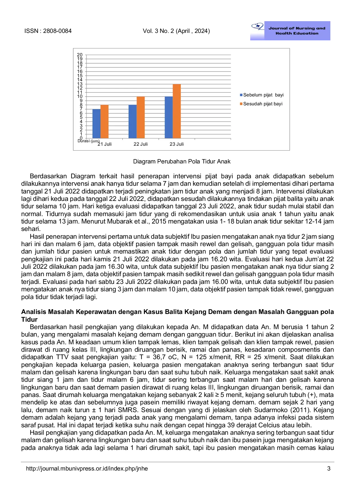 Journal of Nursing and Health EducationJournal of Nursing and Health EducationKejang demam dapat terjadi akibat proses intracranial atau ekstrakranial. Beberapa faktor yang mempengaruhi tidur adalah penyakit, lingkungan, termasuk stimulus lingkungan yang tidak menyenangkan, kelelahan, dan stres. Salah satu penyakit yang sering terjadi adalah kejang demam. Kejang demam adalah kejang yang terjadi ketika suhu tubuh meningkat (suhu mencapai >38 oC). Anak balita dengan kejang demam sering mengalami kejang berulang yang menyebabkan anak sering dirawat di rumah sakit. Ketika balita dirawat di rumah sakit, hal ini dapat menyebabkan ketidaknyamanan seperti gangguan kualitas dan kuantitas tidur. Salah satu upaya terapi non farmakologis untuk meningkatkan kualitas tidur balita adalah dengan pijat balita. Pijat balita dapat membantu meredakan rasa sakit dan gejala penyakit lainnya, meningkatkan relaksasi, dan menenangkan bayi yang menangis sehingga balita dapat tidur lebih nyenyak dan tahan lama.