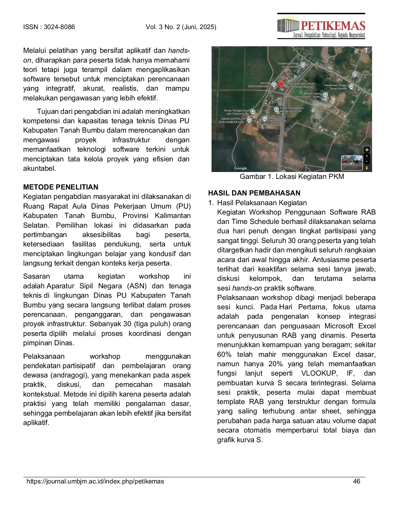 Jurnal Pengabdian Teknologi Kepada MasyarakatJurnal Pengabdian Teknologi Kepada MasyarakatKegiatan pengabdian masyarakat ini bertujuan untuk meningkatkan kapasitas dan kompetensi teknis tenaga perencana dan pengawas di Dinas Pekerjaan Umum (PU) Kabupaten Tanah Bumbu dalam menyusun Rencana Anggaran Biaya (RAB) dan Jadwal Waktu (Time Schedule) proyek infrastruktur menggunakan software, guna mengoptimalkan perencanaan dan pengawasan proyek sehingga mencapai efisiensi biaya dan ketepatan waktu. Metode pelaksanaan terdiri dari beberapa tahap: (1) Ceramah interaktif untuk penyampaian materi konseptual; (2) Demonstrasi langsung (live demonstration) penggunaan software Microsoft Excel (untuk RAB) dan Microsoft Project (untuk Time Schedule); (3) Pelatihan praktis (hands-on training) dimana peserta secara langsung mengaplikasikan software pada studi kasus proyek infrastruktur lokal; (4) Diskusi kelompok dan pemecahan masalah; serta (5) Pendampingan individu. Evaluasi keberhasilan dilakukan menggunakan model Kirkpatrick melalui pre-test/post-test, observasi, kuesioner kepuasan, dan studi kasus simulasi. Kegiatan workshop berhasil dilaksanakan dengan tingkat partisipasi dan antusiasme peserta yang sangat tinggi. Hasil evaluasi menunjukkan peningkatan pengetahuan dan keterampilan peserta yang sangat signifikan, ditunjukkan oleh kenaikan nilai rata-rata sebesar 55.7% dari pre-test (52.4) ke post-test (81.6). Sebanyak 83% peserta berhasil menyusun RAB yang terstruktur dan 73% peserta mampu membuat jadwal proyek dengan logika yang tepat. Reaksi peserta terhadap pelatihan sangat positif, dengan skor kepuasan rata-rata 4.7 dari skala 5. Komitmen penerapan ilmu dalam pekerjaan sehari-hari juga telah terbentuk di kalangan peserta.