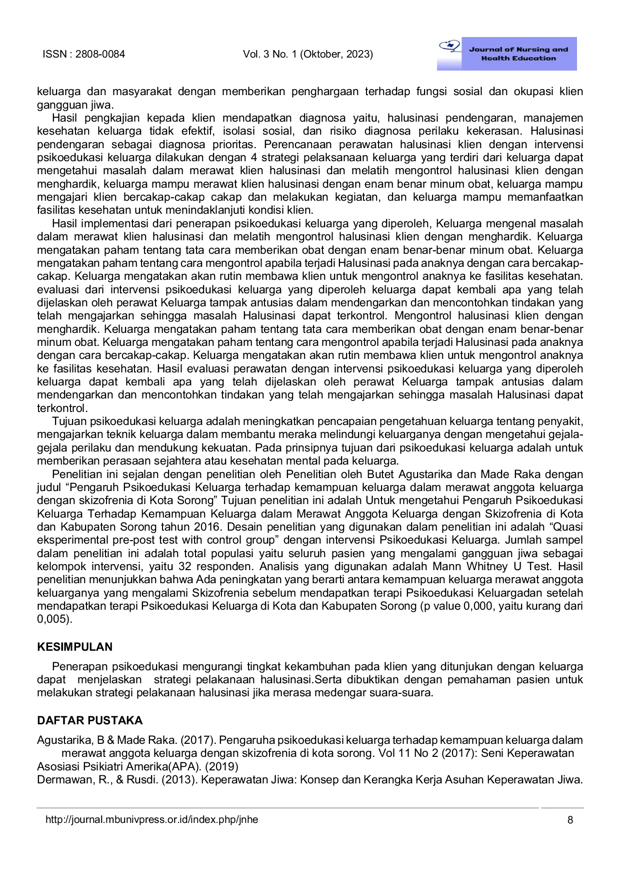Journal of Nursing and Health EducationJournal of Nursing and Health EducationSkizofrenia adalah respons maladaptif terhadap lingkungan yang ditandai dengan pikiran, perasaan, dan perilaku yang tidak sesuai dengan norma atau budaya setempat serta mengganggu fungsi sosial, pekerjaan, dan/atau fisik. Sekitar 70% pasien skizofrenia mengalami halusinasi, yang merupakan perubahan sensori persepsi, merasakan sensasi palsu berupa suara, penglihatan, pengecapan, perabaan, atau penghiduan. Faktor penyebab kekambuhan pada pasien yang kembali ke rumah meliputi kegagalan dalam mengonsumsi obat secara teratur dan ketidakmampuan keluarga dalam merawat pasien. Salah satu tindakan keperawatan yang dapat diterapkan adalah implementasi psikoedukasi keluarga, yaitu salah satu elemen program perawatan kesehatan jiwa keluarga dengan memberikan informasi dan edukasi melalui komunikasi terapeutik.