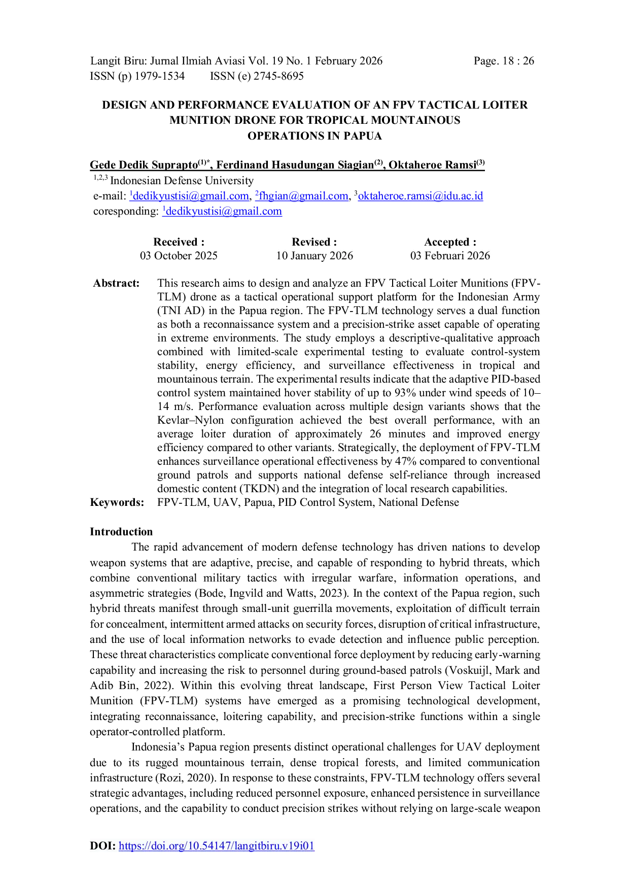 Langit Biru: Jurnal Ilmiah AviasiLangit Biru: Jurnal Ilmiah AviasiThis research aims to design and analyze an FPV Tactical Loiter Munitions (FPV-TLM) drone as a tactical operational support platform for the Indonesian Army (TNI AD) in the Papua region. The FPV-TLM technology serves a dual function as both a reconnaissance system and a precision-strike asset capable of operating in extreme environments. The study employs a descriptive-qualitative approach combined with limited-scale experimental testing to evaluate control-system stability, energy efficiency, and surveillance effectiveness in tropical and mountainous terrain. The experimental results indicate that the adaptive PID-based control system maintained hover stability of up to 93% under wind speeds of 10–14 m/s. Performance evaluation across multiple design variants shows that the Kevlar–Nylon configuration achieved the best overall performance, with an average loiter duration of approximately 26 minutes and improved energy efficiency compared to other variants. Strategically, the deployment of FPV-TLM enhances surveillance operational effectiveness by 47% compared to conventional ground patrols and supports national defense self-reliance through increased domestic content (TKDN) and the integration of local research capabilities.
