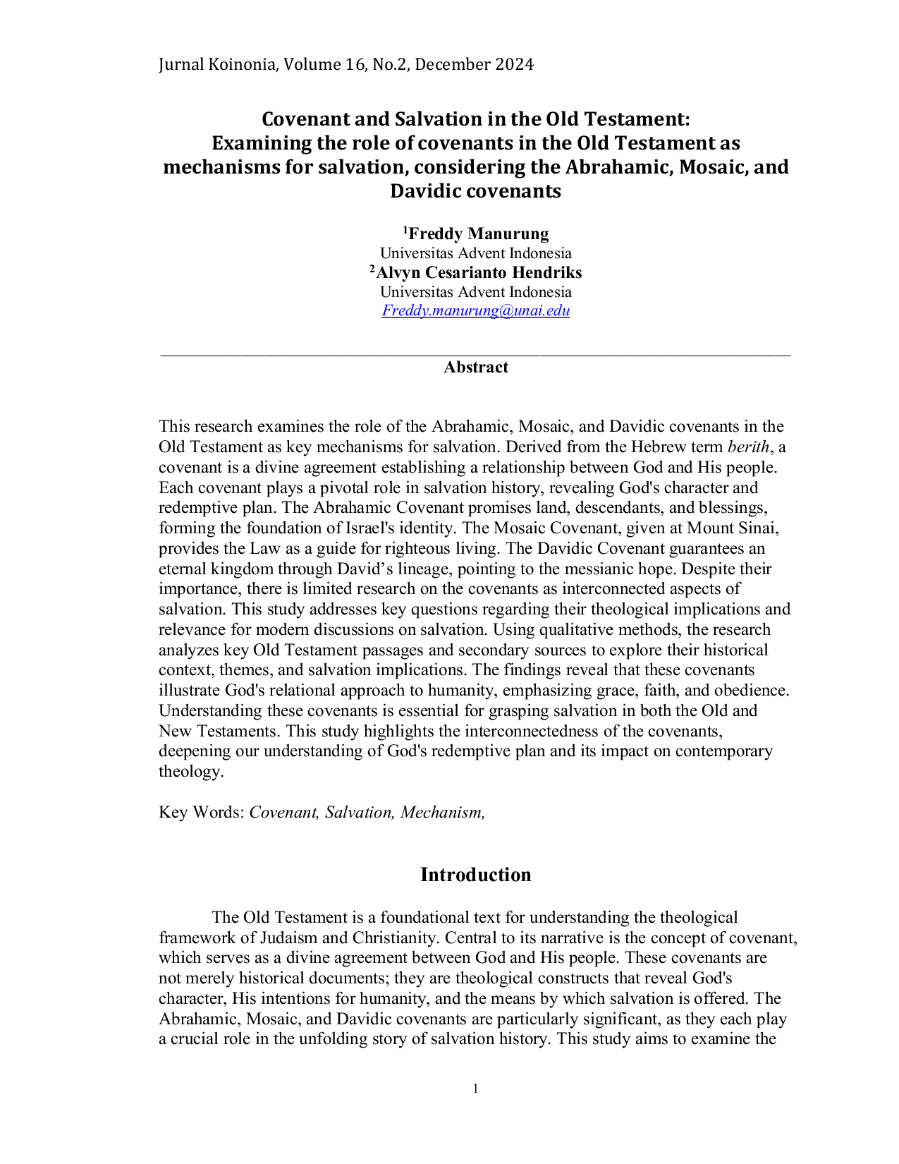 Jurnal Koinonia: Fakultas Filsafat Universitas Advent IndonesiaJurnal Koinonia: Fakultas Filsafat Universitas Advent IndonesiaThis research examines the role of the Abrahamic, Mosaic, and Davidic covenants in the Old Testament as key mechanisms for salvation. Derived from the Hebrew term berith, a covenant is a divine agreement establishing a relationship between God and His people. Each covenant plays a pivotal role in salvation history, revealing Gods character and redemptive plan. The Abrahamic Covenant promises land, descendants, and blessings, forming the foundation of Israels identity. The Mosaic Covenant, given at Mount Sinai, provides the Law as a guide for righteous living. The Davidic Covenant guarantees an eternal kingdom through Davids lineage, pointing to the messianic hope. Despite their importance, there is limited research on the covenants as interconnected aspects of salvation. This study addresses key questions regarding their theological implications and relevance for modern discussions on salvation. Using qualitative methods, the research analyzes key Old Testament passages and secondary sources to explore their historical context, themes, and salvation implications. The findings reveal that these covenants illustrate Gods relational approach to humanity, emphasizing grace, faith, and obedience. Understanding these covenants is essential for grasping salvation in both the Old and New Testaments. This study highlights the interconnectedness of the covenants, deepening our understanding of Gods redemptive plan and its impact on contemporary theology.