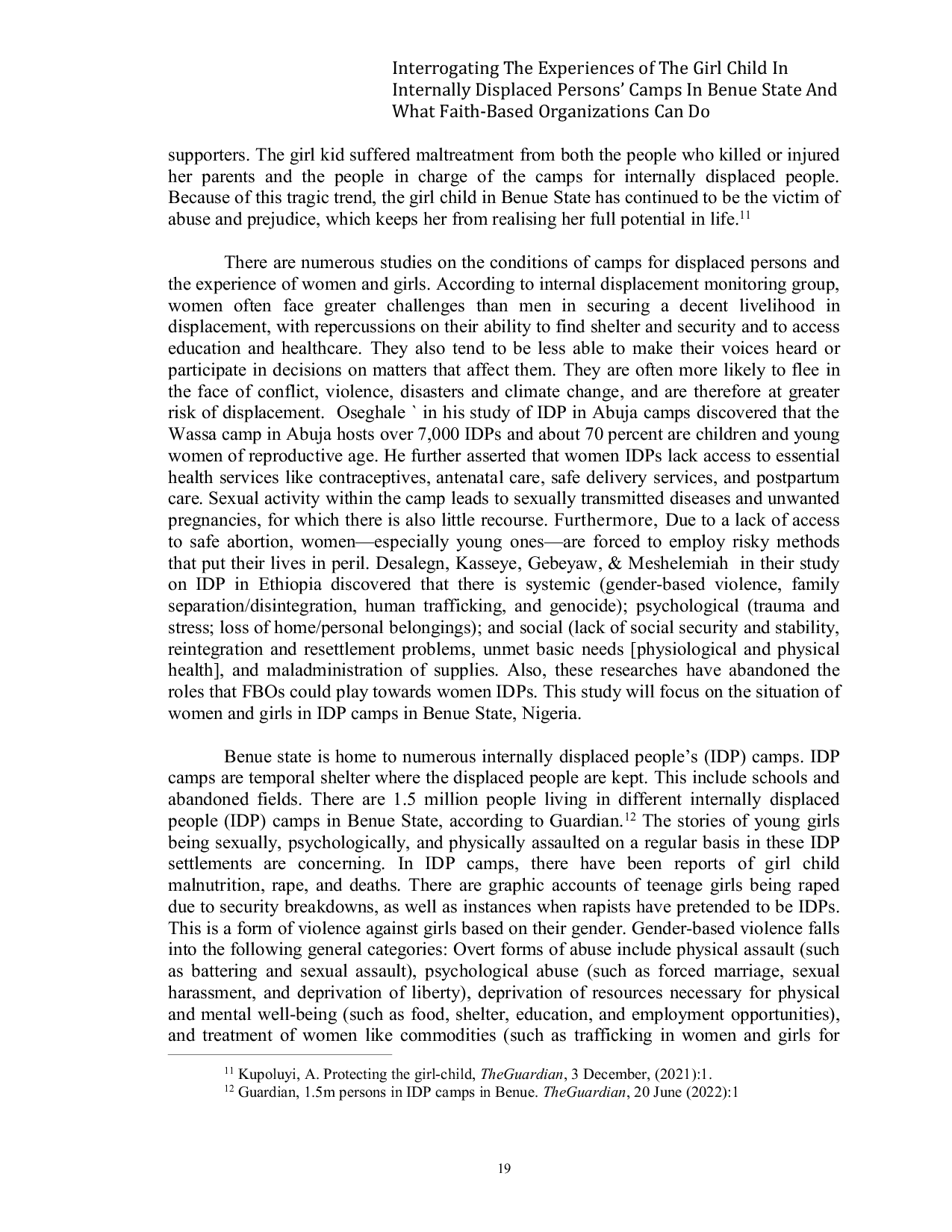 Girls in IDP camps in Benue State face significant challenges including overcrowding, poor sanitation, and a lack of psychological support.These conditions contribute to various forms of abuse, such as sexual violence, exploitation, and increased vulnerability to health risks.The study highlights the urgent need for comprehensive interventions from faith-based organizations and other stakeholders to address the specific needs of girls in these camps and ensure their safety, well-being, and access to essential services.