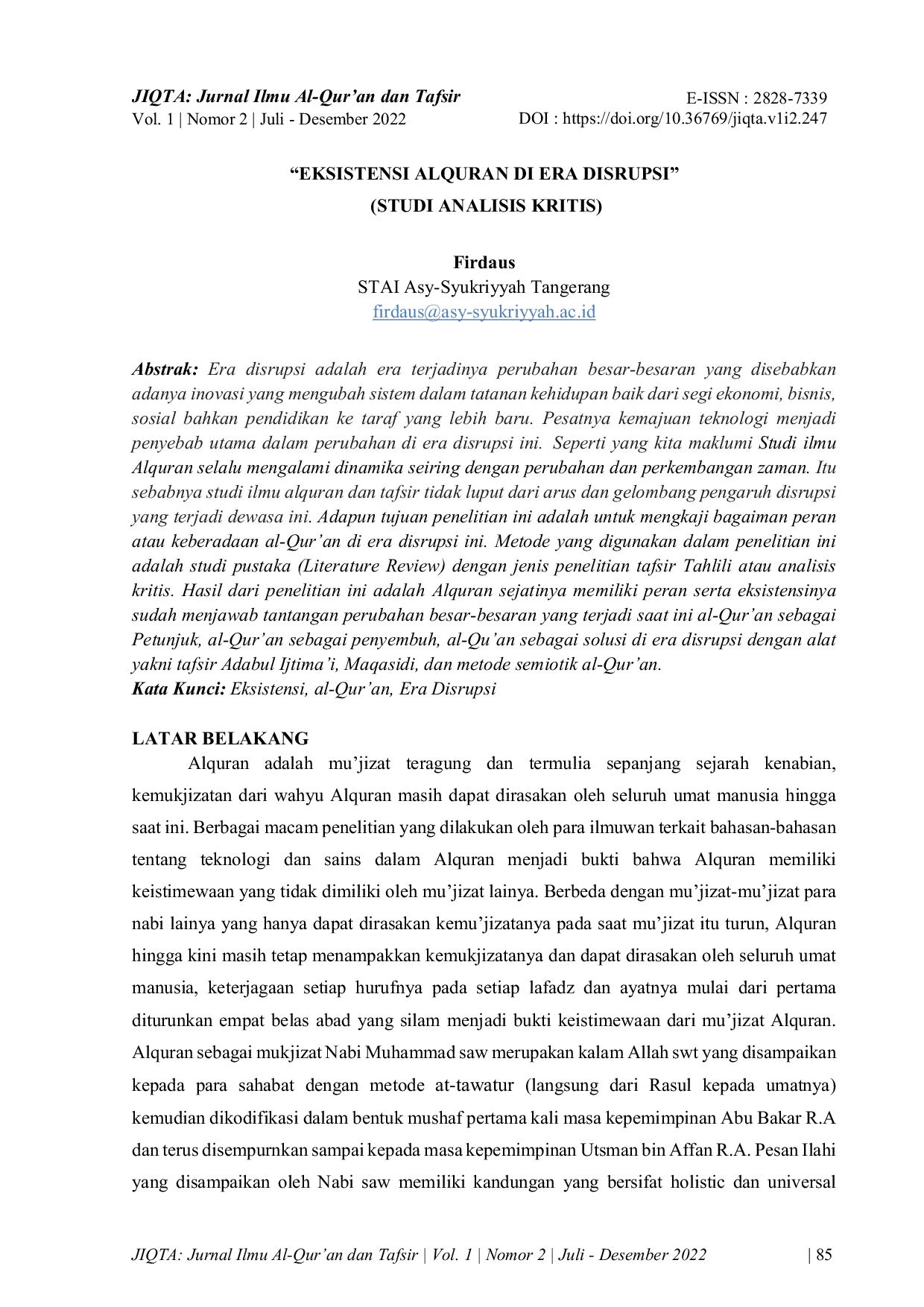 Jurnal Ilmu Al-Qur'an dan Tafsir (JIQTA)Jurnal Ilmu Al-Qur'an dan Tafsir (JIQTA)Era disrupsi adalah era terjadinya perubahan besar-besaran yang disebabkan adanya inovasi yang mengubah sistem dalam tatanan kehidupan baik dari segi ekonomi, bisnis, sosial bahkan pendidikan ke taraf yang lebih baru. Pesatnya kemajuan teknologi menjadi penyebab utama dalam perubahan di era disrupsi ini. Seperti yang kita maklumi Studi ilmu Alquran selalu mengalami dinamika seiring dengan perubahan dan perkembangan zaman. Itu sebabnya studi ilmu alquran dan tafsir tidak luput dari arus dan gelombang pengaruh disrupsi yang terjadi dewasa ini. Adapun tujuan penelitian ini adalah untuk mengkaji bagaiman peran atau keberadaan al-Quran di era disrupsi ini.