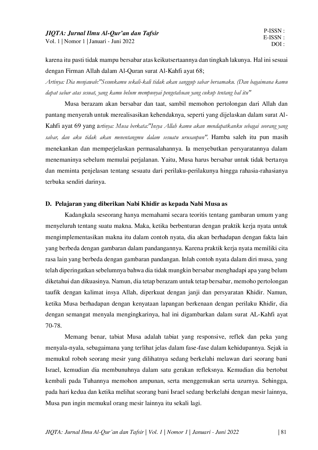 Jurnal Ilmu Al-Qur'an dan Tafsir (JIQTA)Jurnal Ilmu Al-Qur'an dan Tafsir (JIQTA)Rasulullah SAW dalam menyebarkan ajaran Islam penuh dengan kelembutan, apa yang disampaikan selalu menjadi contoh yang baik bagi umatnya. Beliau adalah pemimpin yang sukses dalam memimpin dan menyebarkan pemahaman agama Islam, sehingga seluruh umat manusia dapat mengikuti apa yang diajarkan. Demikian pula ketika Nabi Khidr mengajarkan ilmu yang tidak dipahami oleh Nabi Musa. Nabi Musa juga dapat menjadi pelajaran bagi kita semua untuk mencari ilmu. Etika sangat penting bagi setiap pelajar pengetahuan, sebagaimana yang telah diabadikan Allah dalam Surah Al-Kahf ayat 66-78. Penulis mencoba meneliti dan menggambarkan Etika dalam Belajar dalam Al-Quran dengan harapan kita dapat sukses dalam belajar sehingga pengetahuan yang kita cari dapat dipraktikkan dan bermanfaat bagi seluruh umat manusia. Karena pengetahuan adalah seperti lampu yang selalu menerangi jalan kita, tanpa pengetahuan manusia akan selalu terjebak dalam kebodohan dan ketidaktaatan. Oleh karena itu, penulis mencoba menggambarkan secara rinci bagaimana kita mencari ilmu sehingga pengetahuan yang kita pelajari dapat mencapai kita yang mempelajarinya dan dapat bermanfaat bagi semua. Ada banyak pelajaran yang dapat kita ambil dari pertemuan antara Nabi Khidir dan Nabi Musa, yang paling menonjol adalah etika dalam belajar. Etika dalam belajar sangat penting, ketika seorang guru belum menjelaskan lebih baik kita diam dan mengikuti pelajaran dengan baik. Guru memiliki metode dan cara mereka sendiri dalam mendidik murid mereka untuk mencapai tujuan belajar.