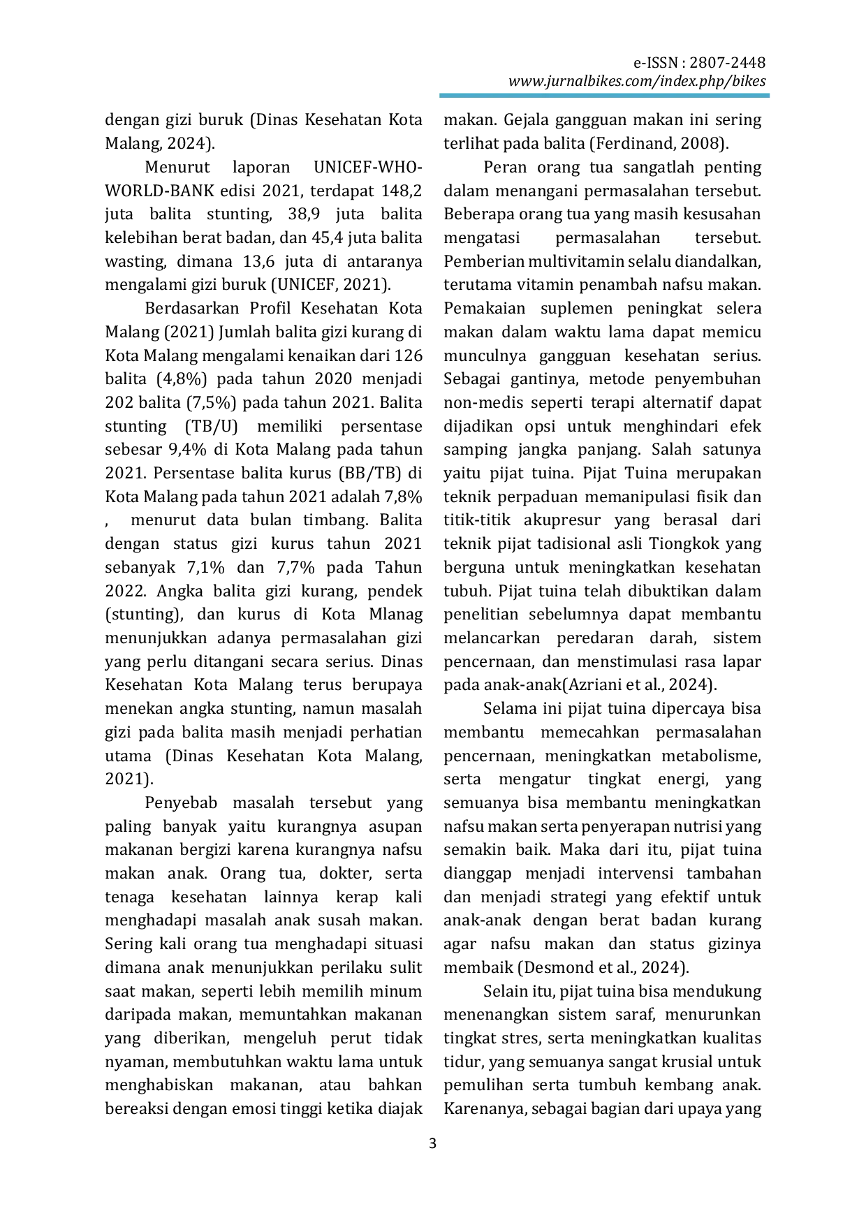 JURNAL KEBIDANAN, KEPERAWATAN DAN KESEHATAN (BIKES)JURNAL KEBIDANAN, KEPERAWATAN DAN KESEHATAN (BIKES)Balita merupakan kelompok usia rentan terhadap gangguan pertumbuhan akibat kurangnya asupan gizi, yang salah satu penyebab utamanya adalah rendahnya nafsu makan. Pijat Tuina, sebagai metode terapi komplementer dari pengobatan tradisional Tiongkok, diketahui mampu merangsang titik-titik meridian tubuh yang berhubungan dengan sistem pencernaan dan metabolisme. Studi ini bertujuan untuk mengetahui dampak pijat tuina pada peningkatan nafsu makan serta berat badan pada balita berdasarkan temuan studi terdahulu. Artikel ini merupakan tinjauan literatur dengan pendekatan naratif, menelaah 10 artikel ilmiah yang dipublikasikan antara tahun 2019 hingga 2024. Literatur yang dikaji mencakup subjek balita usia 1–5 tahun dengan nafsu makan rendah. Sebagian besar studi menunjukkan bahwa pijat tuina berdampak signifikan pada peningkatan nafsu makan serta berat badan balita. Teknik yang digunakan mencakup tekanan, gesekan, dan stimulasi titik-titik tertentu di perut, punggung, kaki, dan tangan. Intervensi dengan durasi minimal 6 hari dan frekuensi 3 kali per minggu menunjukkan hasil paling konsisten. Selain peningkatan nafsu makan, beberapa studi juga mencatat peningkatan kualitas tidur dan status gizi balita. Pijat tuina terbukti memiliki pengaruh positif terhadap nafsu makan dan berat badan balita. Teknik ini dapat digunakan sebagai terapi tambahan yang aman dan mudah diterapkan dalam layanan kesehatan anak. Penelitian lebih lanjut dengan desain acak terkontrol dan protokol intervensi yang terstandar diperlukan untuk memperkuat bukti ilmiah.