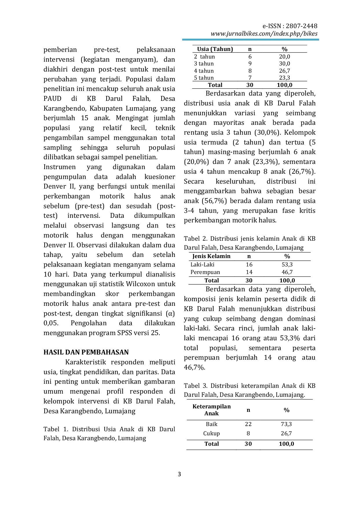 JURNAL KEBIDANAN, KEPERAWATAN DAN KESEHATAN (BIKES)JURNAL KEBIDANAN, KEPERAWATAN DAN KESEHATAN (BIKES)Perkembangan motorik halus pada anak usia dini sangat penting sebagai dasar keterampilan fungsional anak di masa depan. Penelitian ini bertujuan untuk mengetahui pengaruh kegiatan menganyam terhadap motorik halus pada anak PAUD di KB Darul Falah, Desa Karangbendo, Lumajang. Desain penelitian yang digunakan adalah pre-experimental design two group pretest-posttest dengan pemberian intervensi kegiatan menganyam selama 10 hari. Hasil analisis menunjukkan bahwa sebelum intervensi, sebagian besar anak berada pada kategori Belum Berkembang (BB) sebanyak 10 anak (33,3%), Mulai Berkembang (MB) 14 anak (46,7%), dan Sesuai Harapan (BSH) 6 anak (20%). Setelah intervensi, terjadi peningkatan signifikan dengan 66,7% anak mencapai kategori Sangat Baik (BSB). Kegiatan menganyam terbukti efektif sebagai metode stimulasi motorik halus pada anak PAUD.