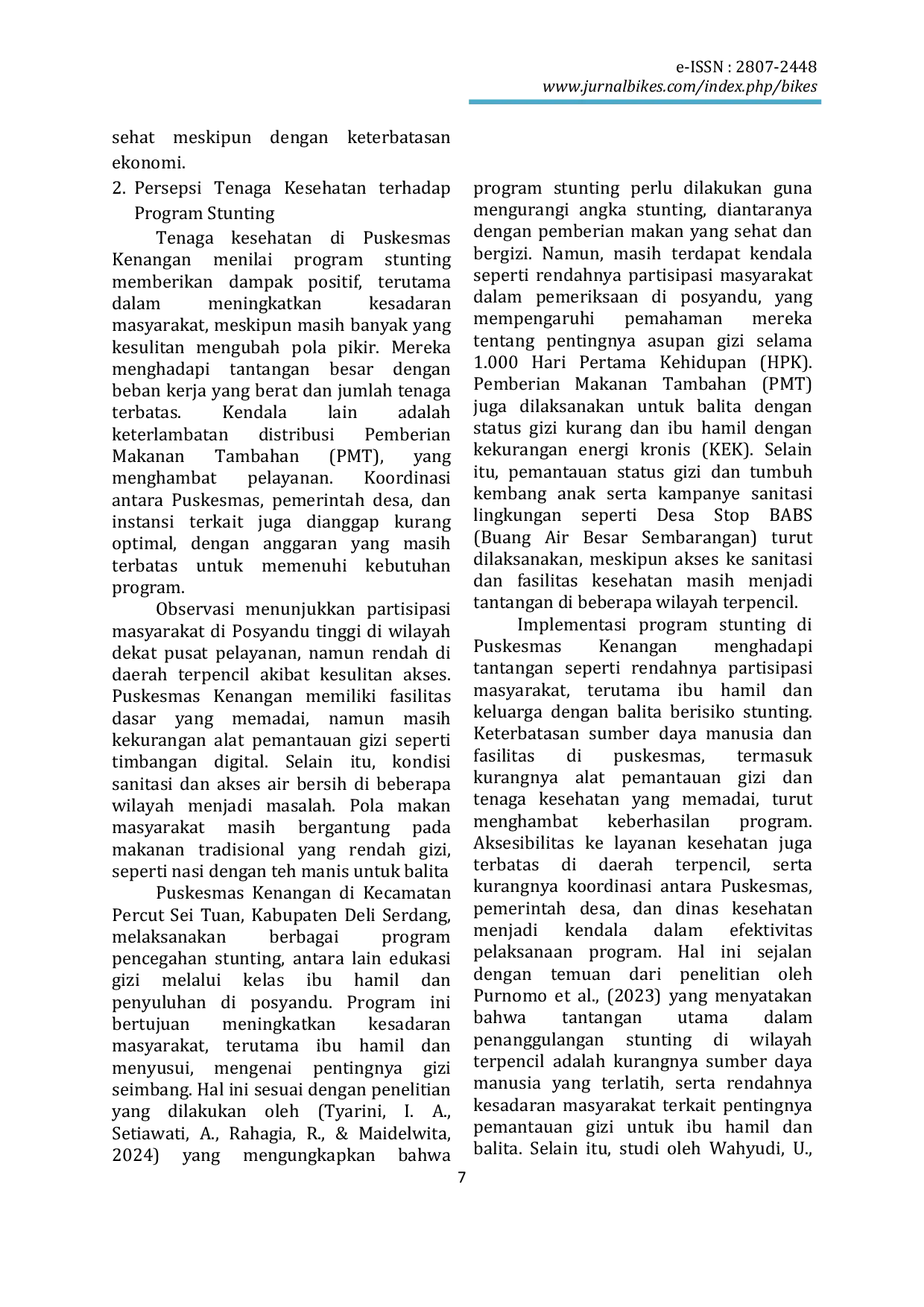 JURNAL KEBIDANAN, KEPERAWATAN DAN KESEHATAN (BIKES)JURNAL KEBIDANAN, KEPERAWATAN DAN KESEHATAN (BIKES)Penelitian ini bertujuan untuk menganalisis pelaksanaan program stunting di Puskesmas Kenangan, Kecamatan Percut Sei Tuan, Kabupaten Deli Serdang, guna memahami implementasi, tantangan, serta faktor yang memengaruhi keberhasilan program. Pendekatan kualitatif deskriptif digunakan untuk menggali secara mendalam pengalaman, persepsi, dan pandangan para pemangku kepentingan. Pengumpulan data dilakukan melalui wawancara mendalam, observasi partisipatif, dan studi dokumen dengan melibatkan 35 balita, 35 orang tua/wali, 7 tenaga kesehatan, 2 tokoh masyarakat. Analisis data dilakukan menggunakan teknik analisis isi dengan tahapan pengkodean, kategorisasi, dan interpretasi. Hasil penelitian menunjukkan bahwa Puskesmas Kenangan telah mengimplementasikan program sesuai pedoman nasional, seperti edukasi gizi selama 1.000 Hari Pertama Kehidupan (HPK), pemberian makanan tambahan, imunisasi, pemantauan tumbuh kembang anak, serta kampanye sanitasi lingkungan. Namun, dalam pelaksanaanya terdapat tantangan signifikan meliputi hambatan geografis, distribusi logistik yang tidak optimal, rendahnya kesadaran masyarakat terhadap pentingnya gizi, serta keterbatasan tenaga kesehatan yang berakibat pada tingginya beban kerja. Keberhasilan program didukung oleh komitmen tenaga kesehatan, kebijakan nasional yang memberikan panduan pelaksanaan di tingkat lokal, serta partisipasi masyarakat melalui Posyandu.